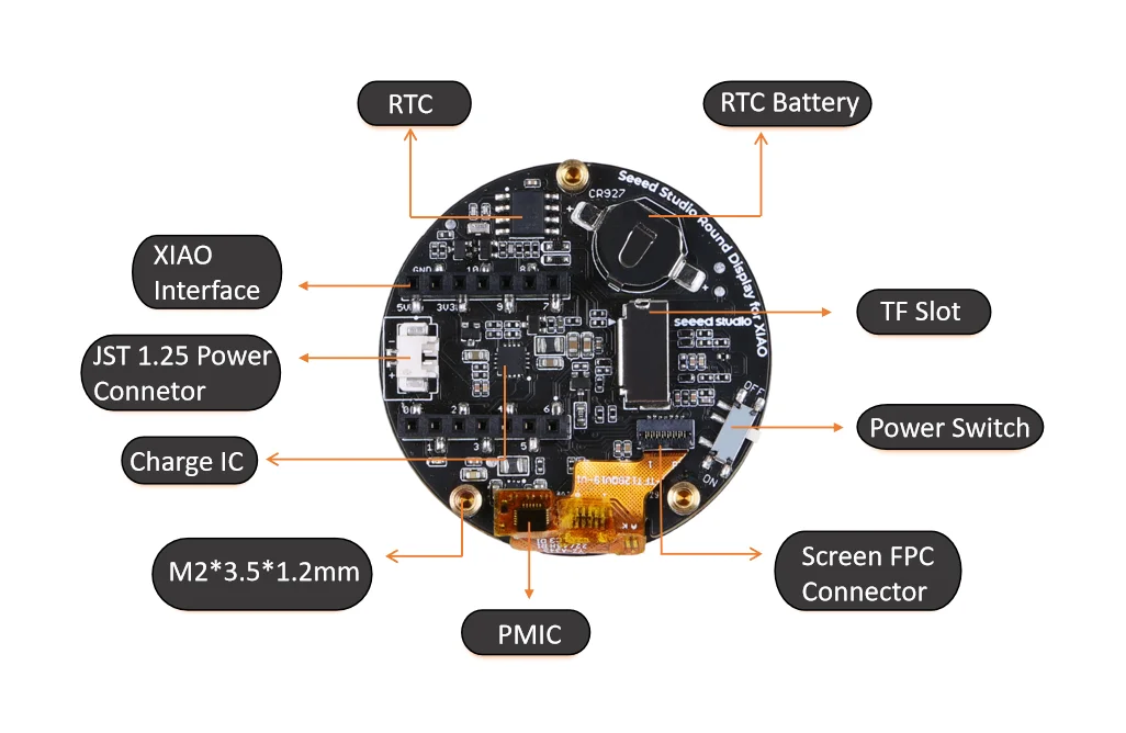 Seeed Studio Round Display for XIAO is an extension board with capacitive touch screen and is compatible with all XIAO development boards. It features a fully covered touch screen on one side, designed as a radiant disc with a radius of 39 mm.