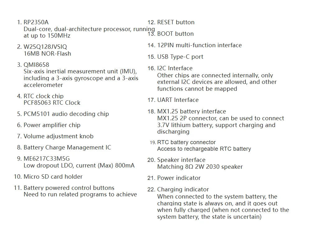 Altavoces integrados, sensor de seis ejes QMI8658, sensor de reloj RTC, soporte para tarjeta Micro SD y módulo de gestión de carga de batería, etc.