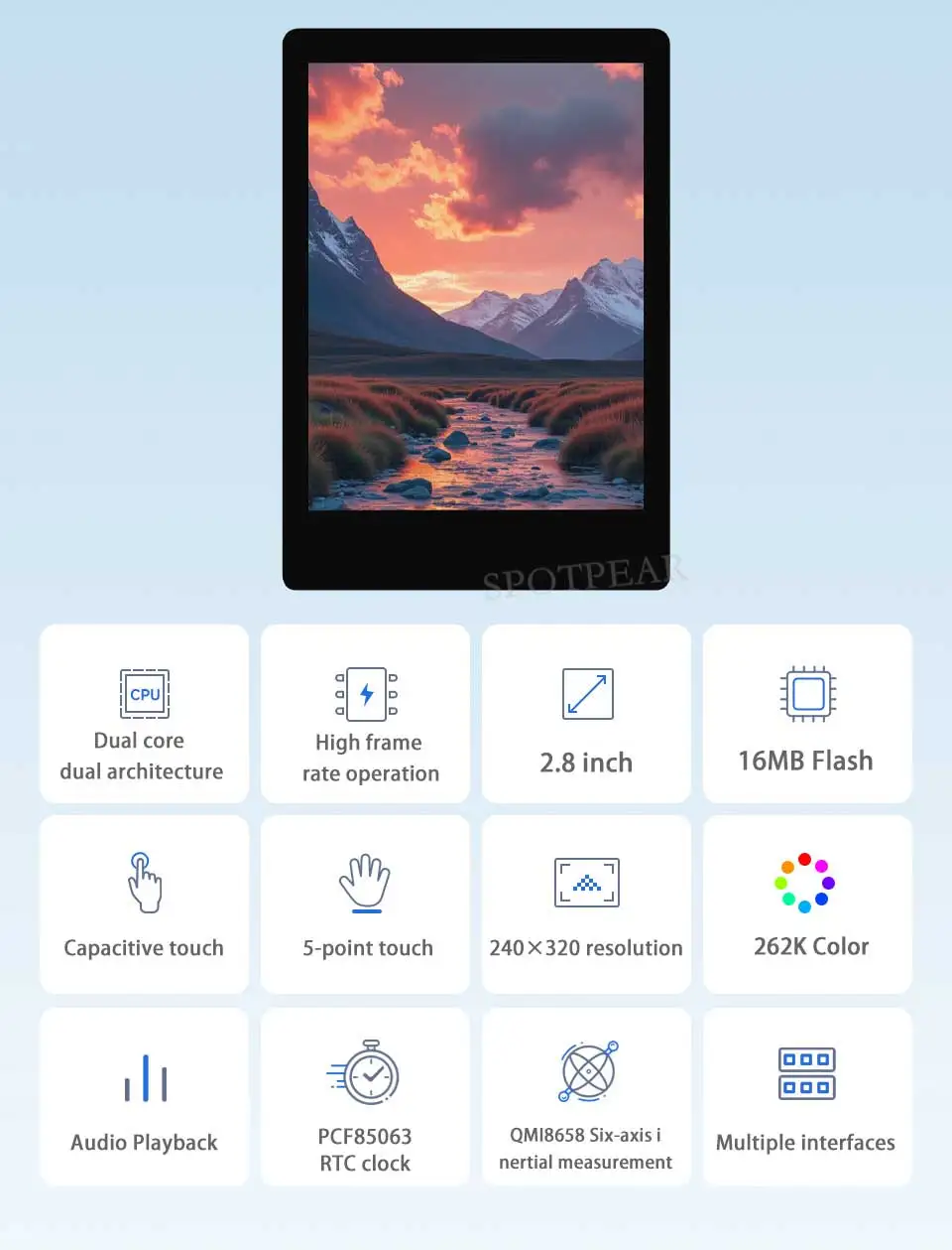 Este producto es una placa de desarrollo de microcontroladores de bajo costo y alto rendimiento diseñada por Waveshare.Tiene una pantalla LCD de 2,8 pulgadas, un chip de carga de batería de litio, un sensor de seis ejes (acelerómetro de tres ejes y giroscopio de tres ejes), RTC y otros periféricos a bordo, lo cual es conveniente para el desarrollo y la integración en productos.Puede ejecutar programas de interfaz GUI como LVGL sin problemas.