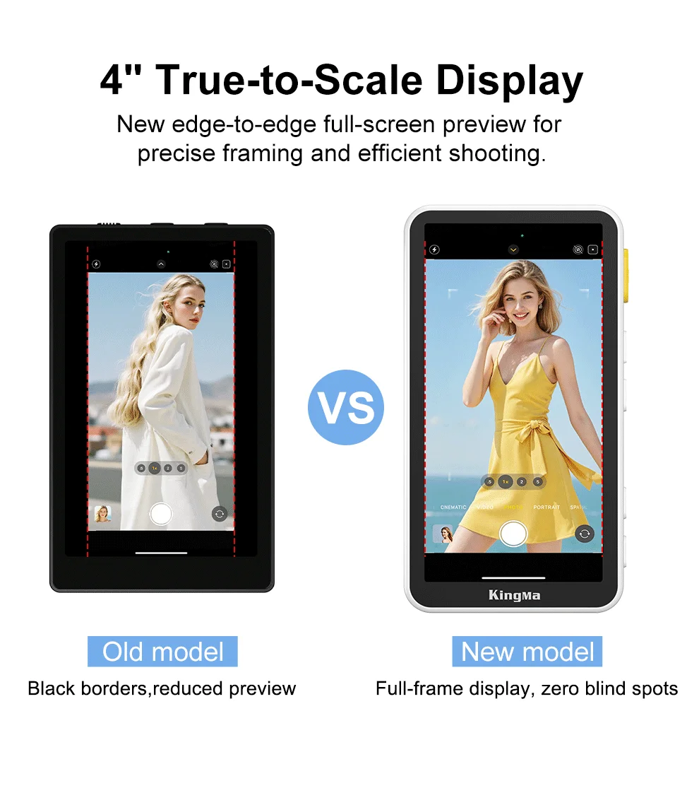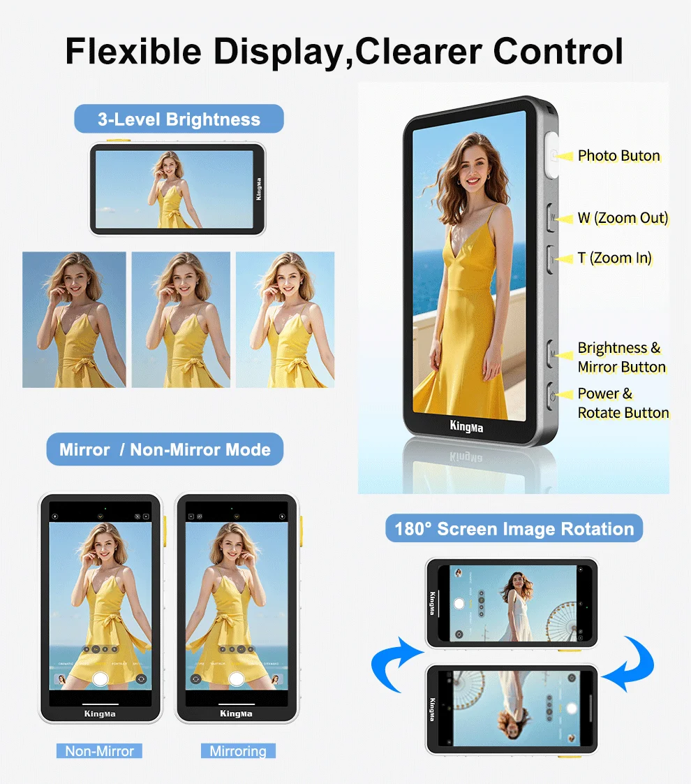 Pantalla de fotograma completo sin puntos ciegos, 180° rotación, brillo ajustable y modo espejo para encuadrar con precisión en cualquier lugar.