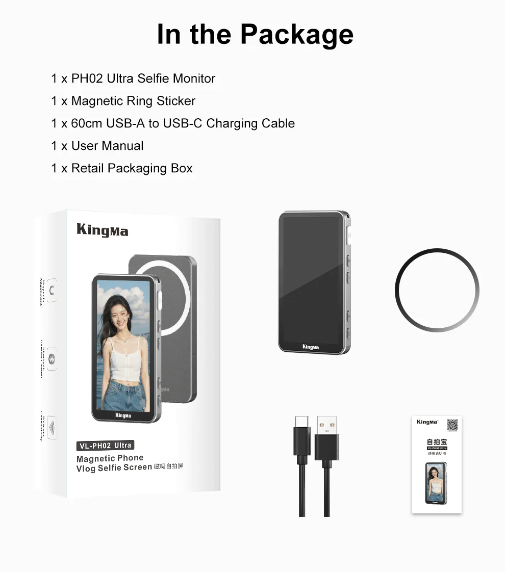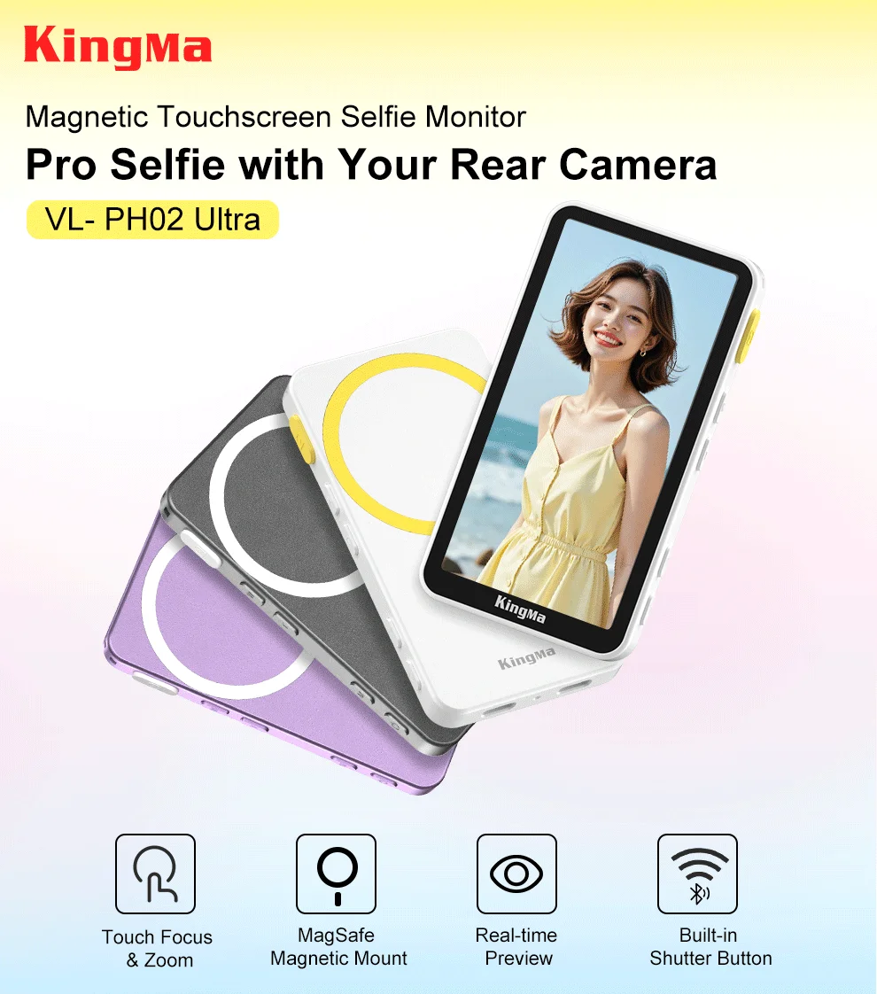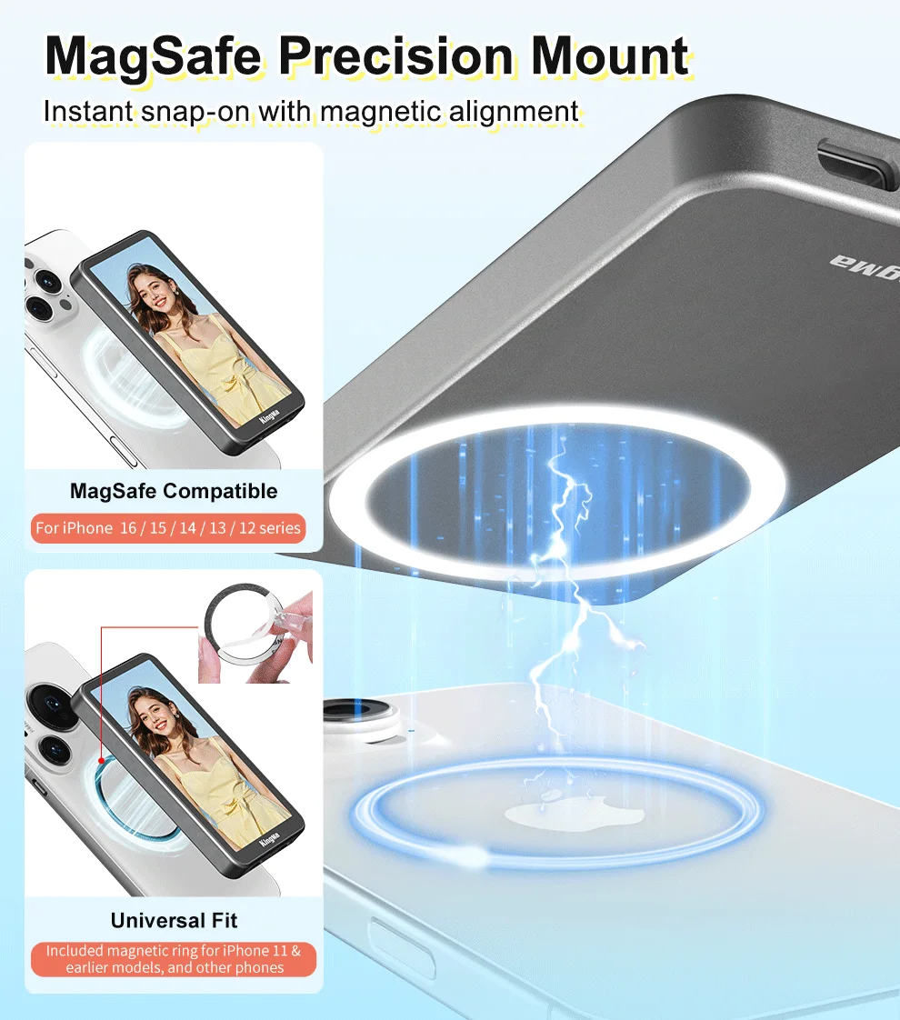 El monitor para selfies PH02 ULTRA encaja en el iPhone 12-16 a través de MagSafe para obtener una vista previa de borde a borde en tiempo real y un duplicación inalámbrica 4K/30 de baja latencia: use la cámara trasera para selfies más nítidos.