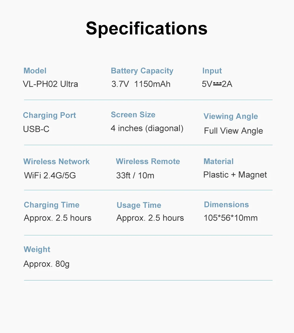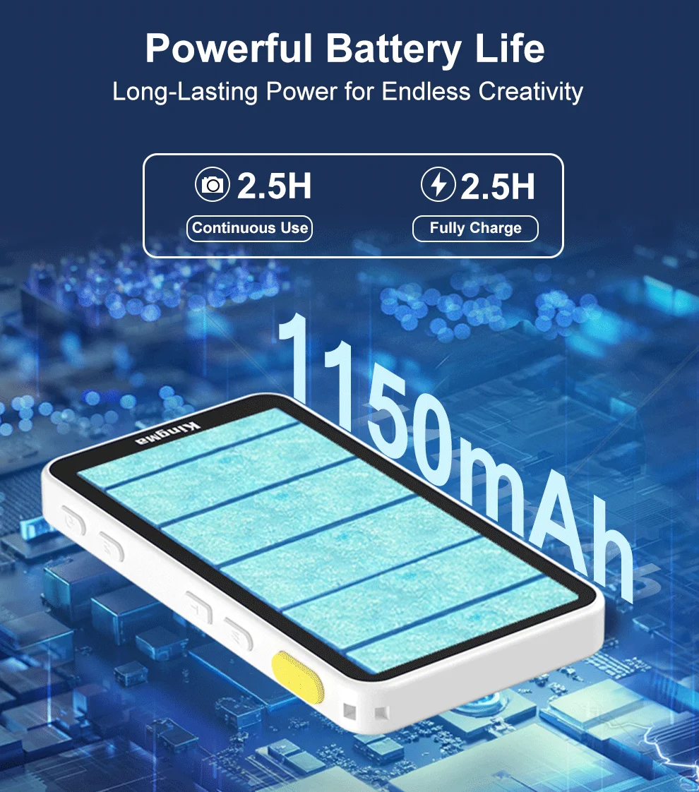 Hasta 2,5 h de uso y ~2,5 h de recarga; Deslice para revisar los álbumes al instante. Nota: Grabación inalámbrica 4K/30 en iPhone 15/16 (iOS 18+); 1080p en iPhone 14 y anteriores (iOS 9+).