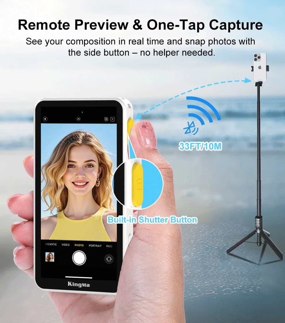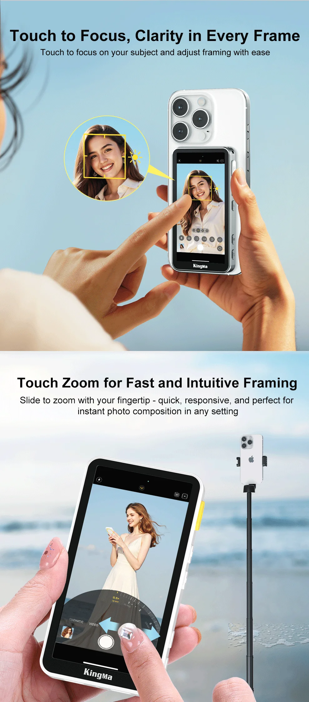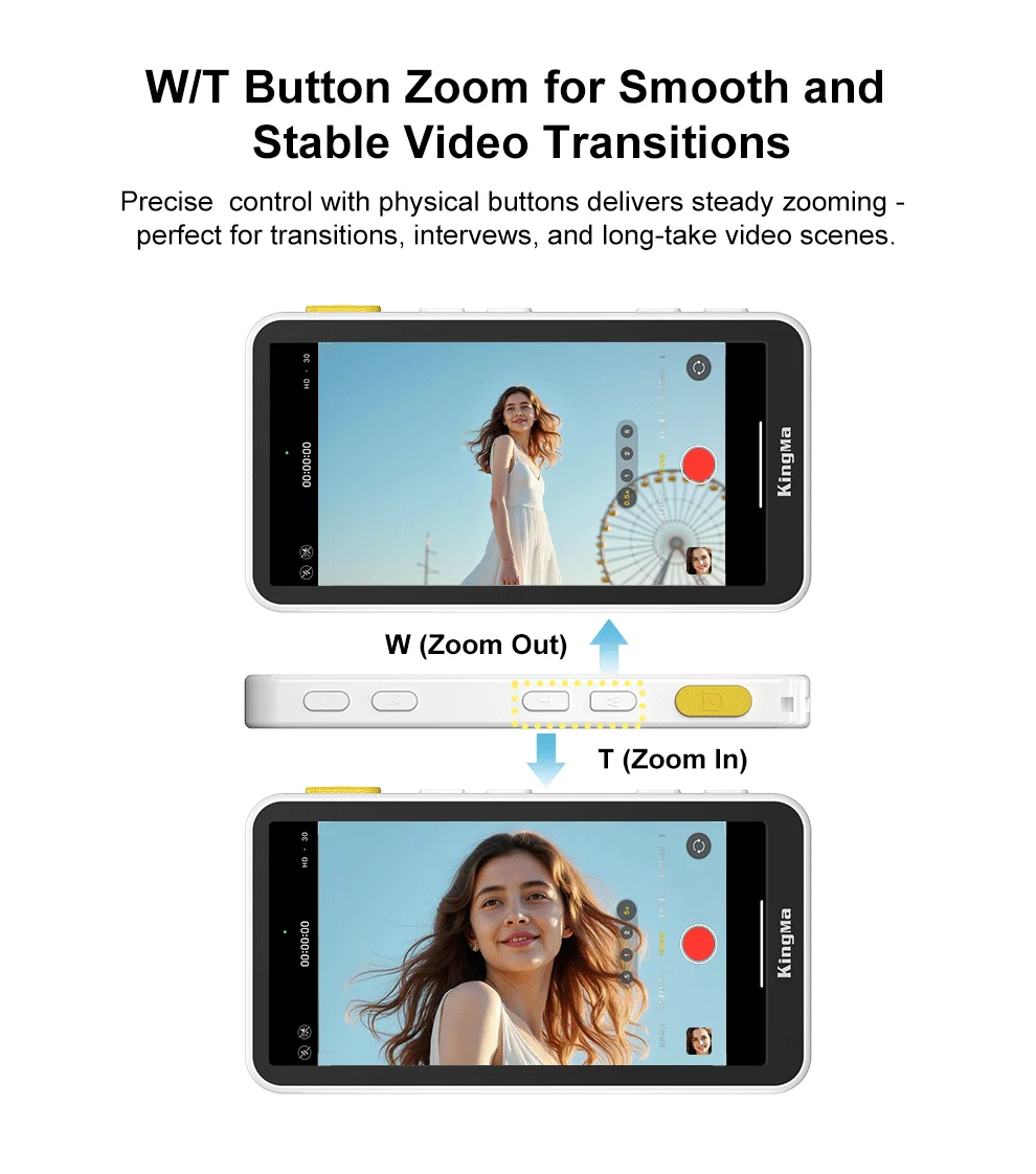 Toque para enfocar, deslize para acercar, obturador con un solo toque en el monitor de selfies; Las teclas de zoom físico W/T mantienen estables las transiciones de video; Rango de control Bluetooth de hasta 33 pies/10 m.