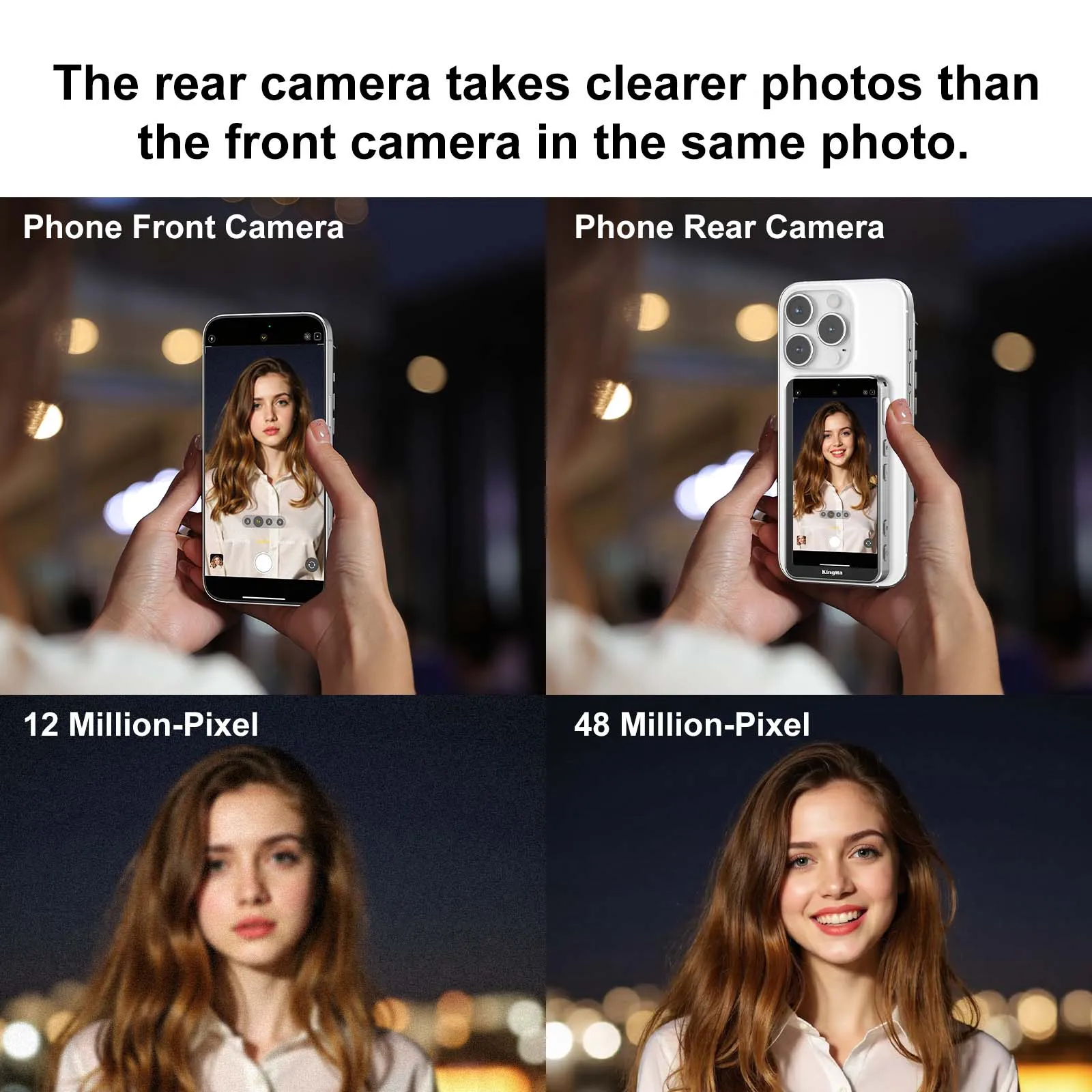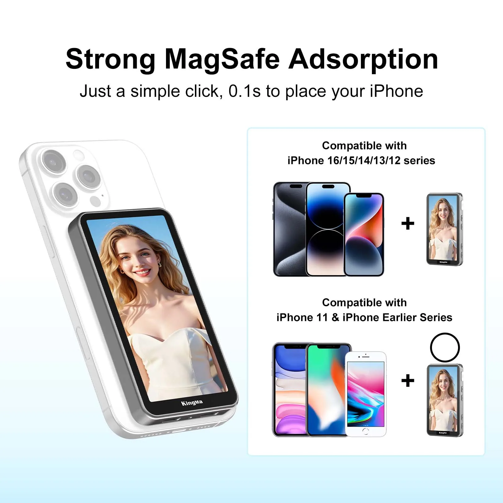 El monitor para selfies PH02 ULTRA encaja en el iPhone 12-16 a través de MagSafe para obtener una vista previa de borde a borde en tiempo real y un duplicación inalámbrica 4K/30 de baja latencia: use la cámara trasera para selfies más nítidos.
