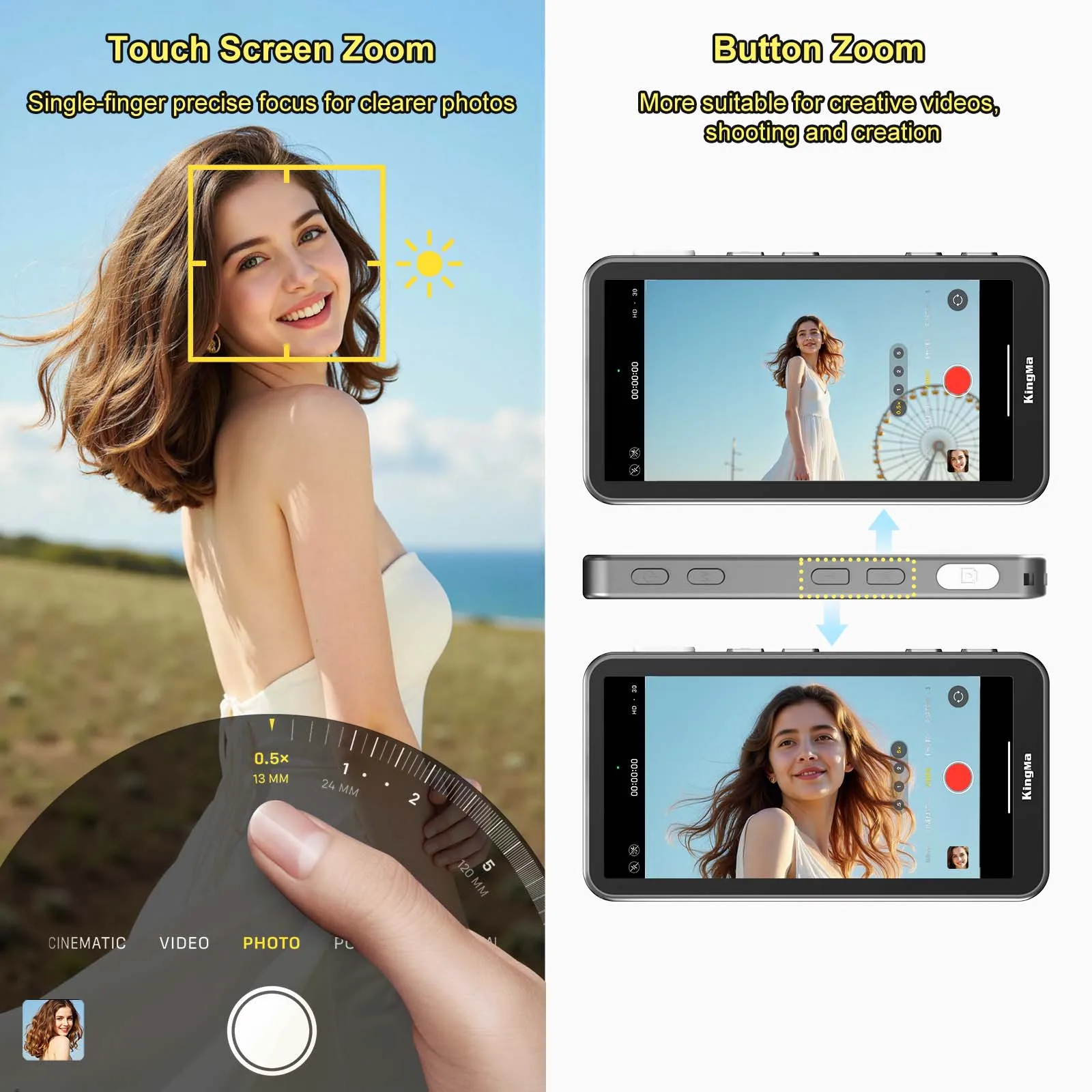 Toque para enfocar, deslize para acercar, obturador con un solo toque en el monitor de selfies; Las teclas de zoom físico W/T mantienen estables las transiciones de video; Rango de control Bluetooth de hasta 33 pies/10 m.