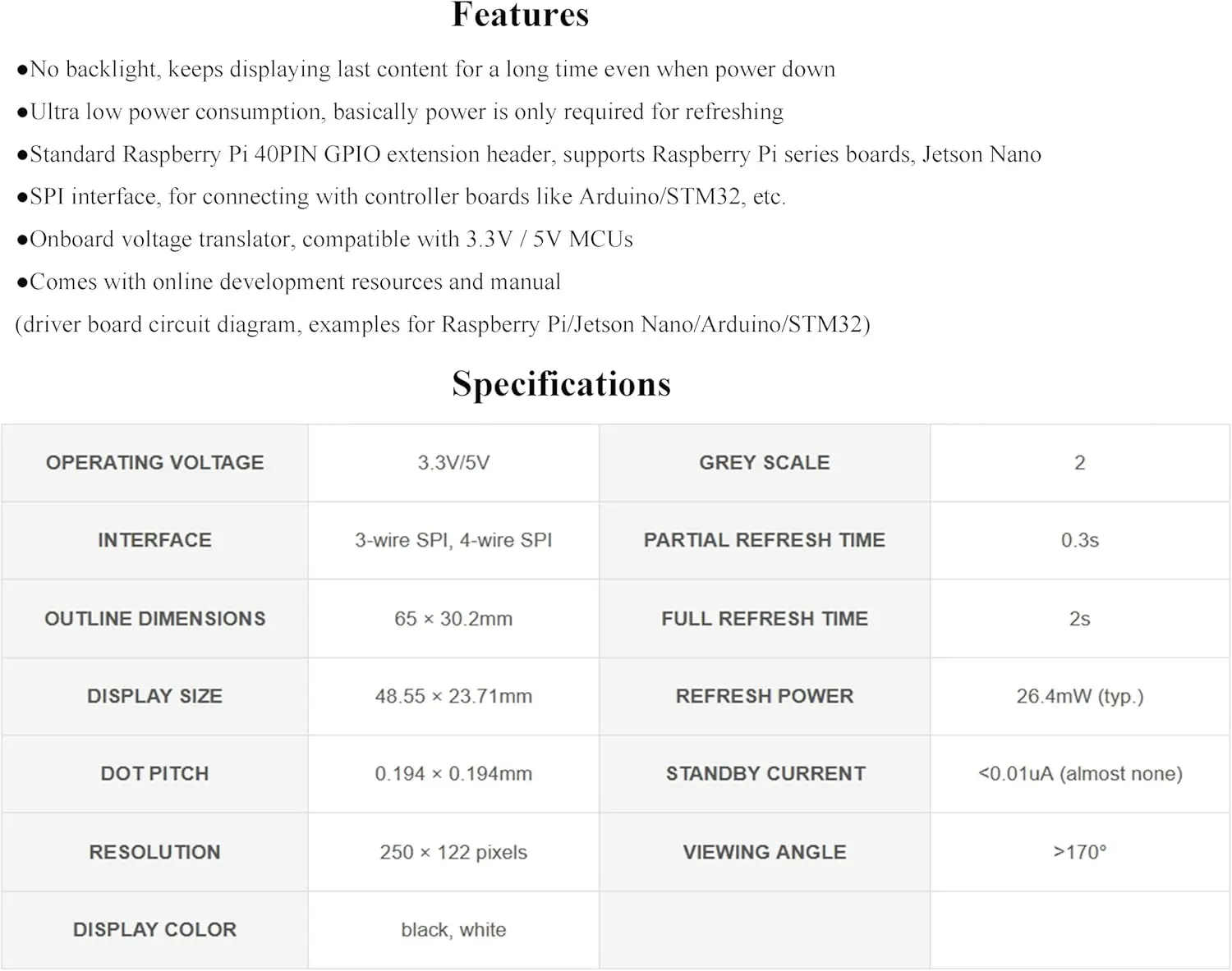 Papel electrónico de 2,13 pulgadas × 1 (sin PCB)