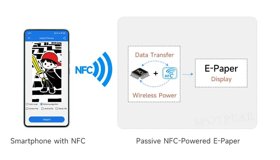 Para actualizar el contenido de la pantalla, use un teléfono inteligente con función NFC o un lector NFC, cerca del papel electrónico, se realizará en unos segundos.