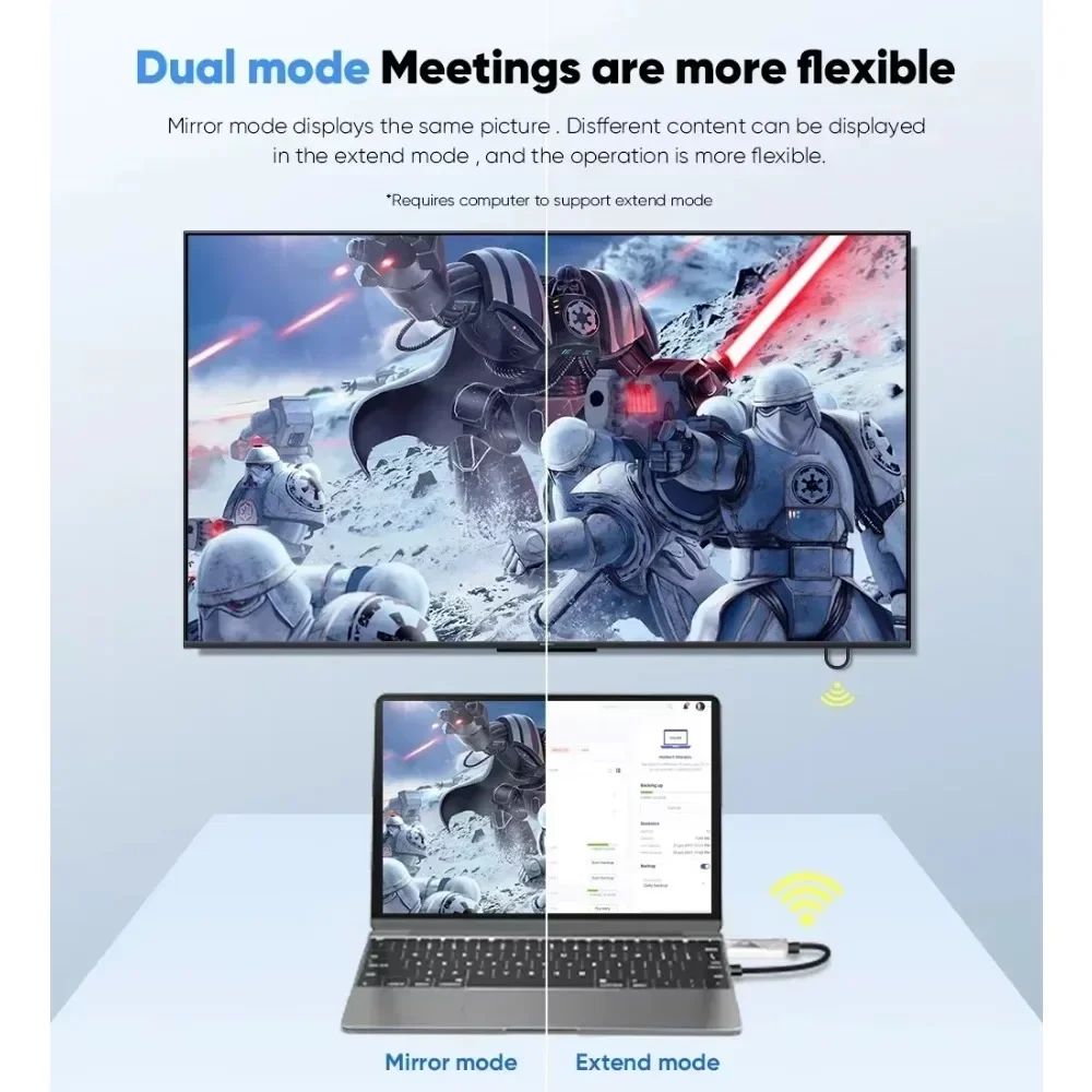 Es Plug and Play. Adecuado para visualización de pantalla grande, proyección de juegos, proyección de transmisión en vivo, proyección de conferencias y contenido de pantalla compartida, es un excelente producto de extensión inalámbrica con transmisión estable y gráficos fluidos.