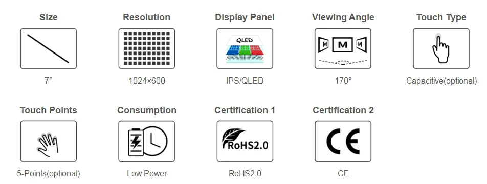 Pantalla IPS/QLED de 7 pulgadas, resolución de hardware 1024x600.