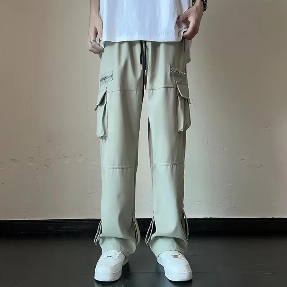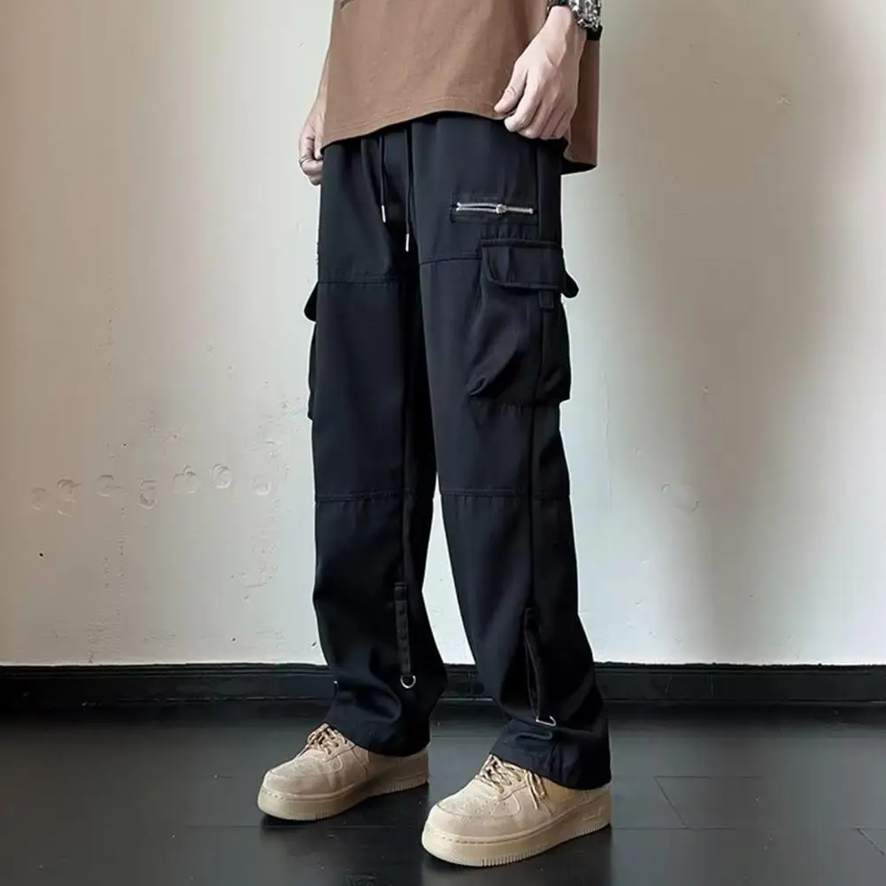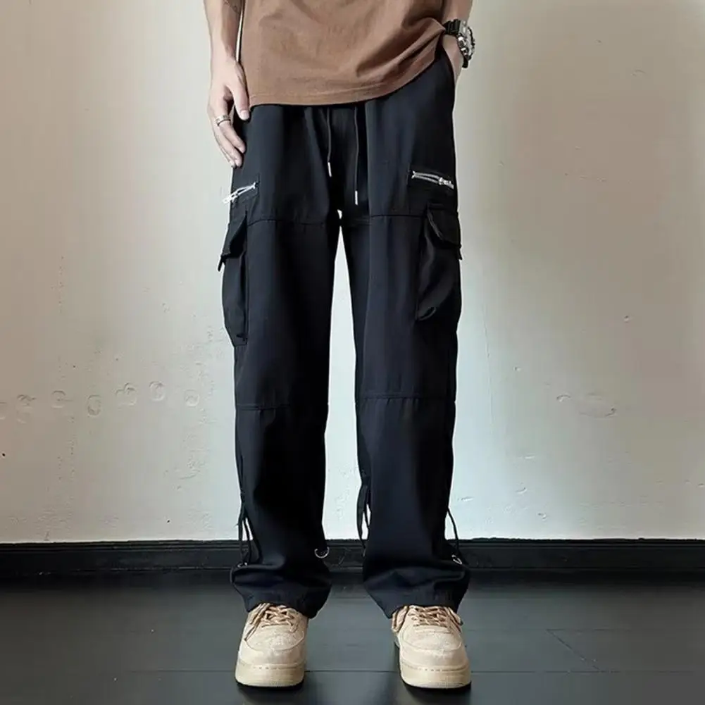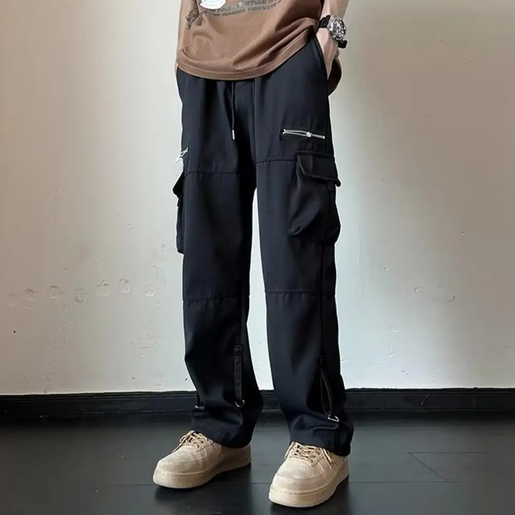 Pantalones de pierna recta, ropa de calle, pantalones Cargo para hombre, pantalones holgados con cremallera y bolsillos, cintura elástica, transpirables, elegantes pantalones de Hip Hop, sólidos