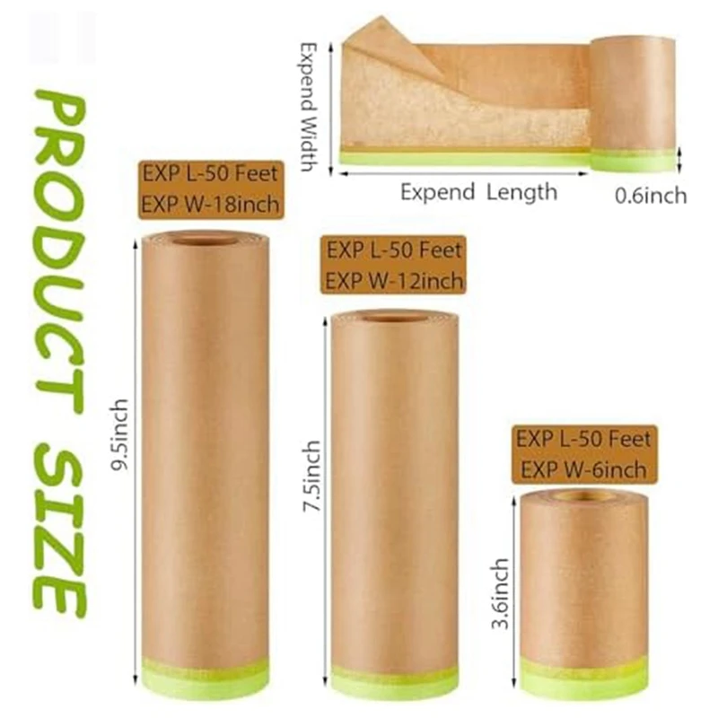 Formas de enmascaramiento en varios tamaños: cada paquete viene con un paquete de 3 rollos de papel de enmascarar pintura en 3 tamaños de ancho diferentes, con tamaños ampliados de 6 pulgadas, 12 pulgadas y 18 pulgadas. Cada rollo de papel de enmascarar mide 50 pies de largo, con diferentes tamaños y longitudes apropiadas para satisfacer sus diversas necesidades.