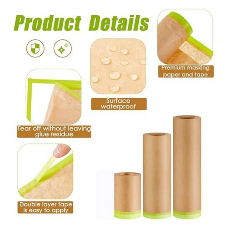 Formas de enmascaramiento en varios tamaños: cada paquete viene con un paquete de 3 rollos de papel de enmascarar pintura en 3 tamaños de ancho diferentes, con tamaños ampliados de 6 pulgadas, 12 pulgadas y 18 pulgadas. Cada rollo de papel de enmascarar mide 50 pies de largo, con diferentes tamaños y longitudes apropiadas para satisfacer sus diversas necesidades.
