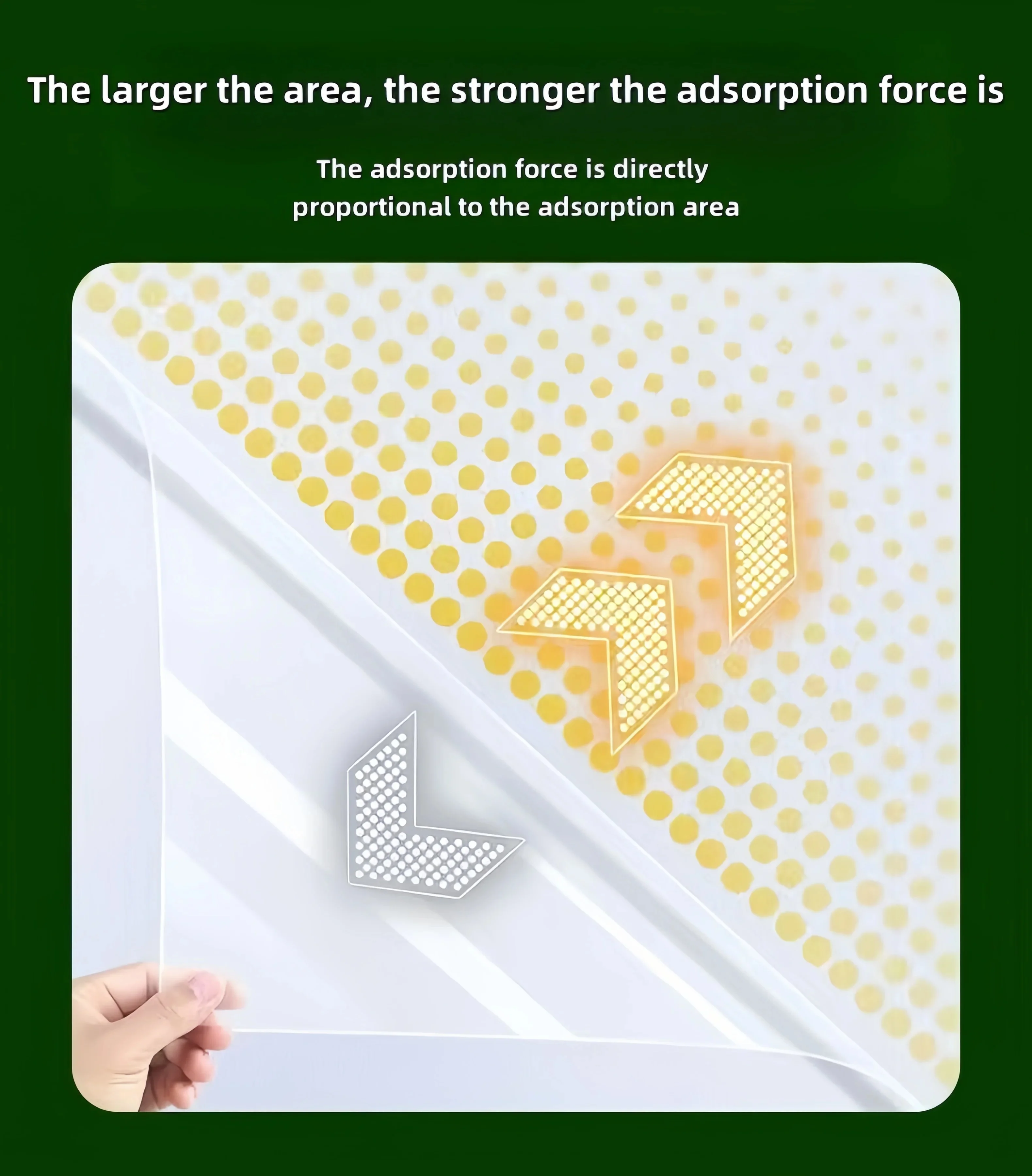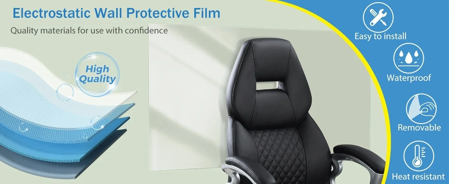 Adsorción electrostática sin pegamento: Se adhiere firmemente mediante fuerza electrostática (no necesita adhesivo), evitando residuos o daños en la pared, más seguro que la cinta tradicional.