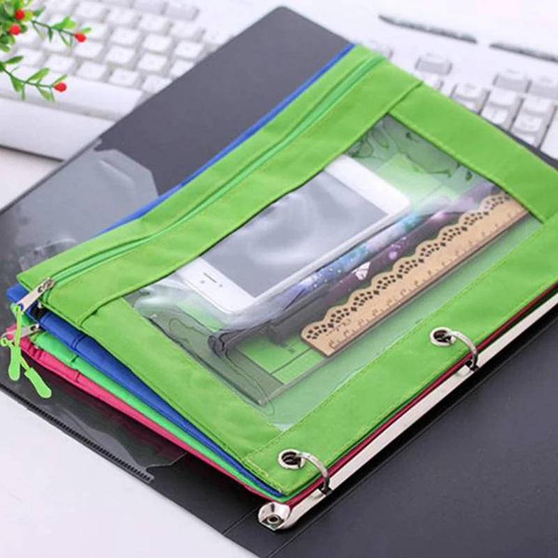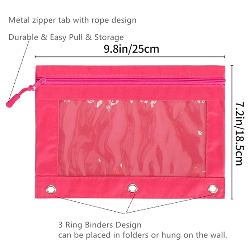 3 anillos que encajan en las carpetas: La bolsa de lápiz con cremallera se sujeta en carpetas estándar de 3 anillos, los agujeros reforzados con remaches encajan en carpetas estándar de 3 anillos, que se puede colocar en carpetas o colgar en la pared.