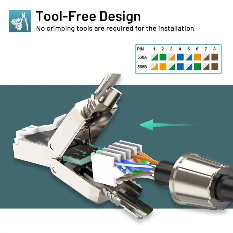 【Cubierta totalmente metálica】Cubierta totalmente metálica RJ45 con conector terminable de campo para conjuntos de cables Cat 7, puntos de acceso inalámbricos y conexiones de servidor y conmutadores de red; Alternativa de metal resistente a los enchufes modulares RJ45.
