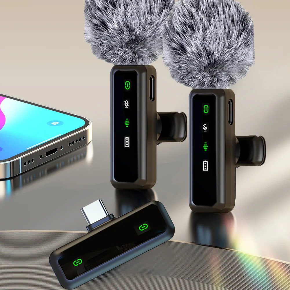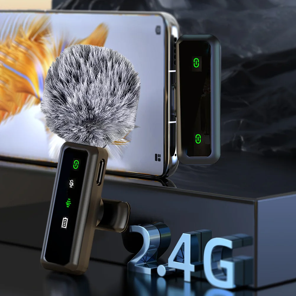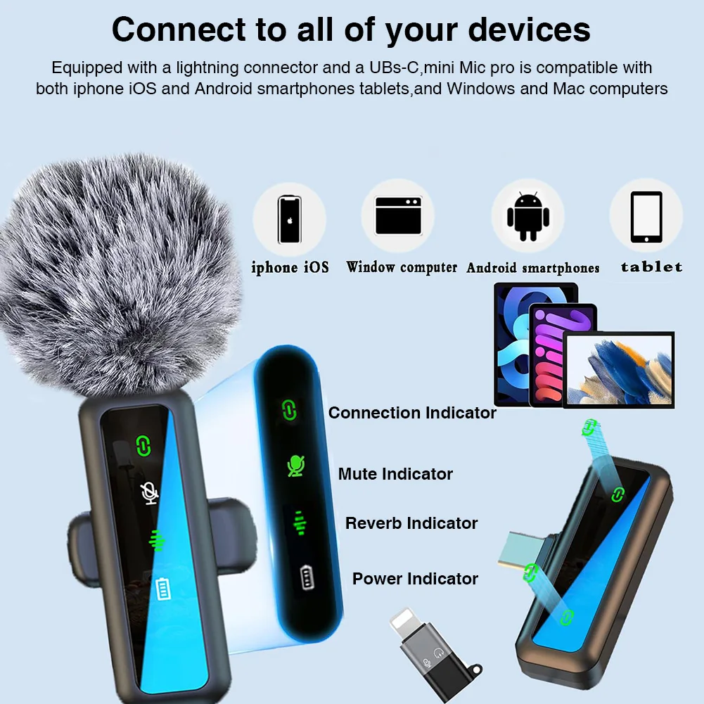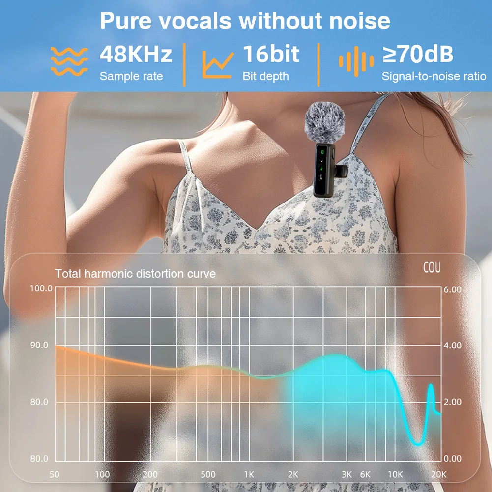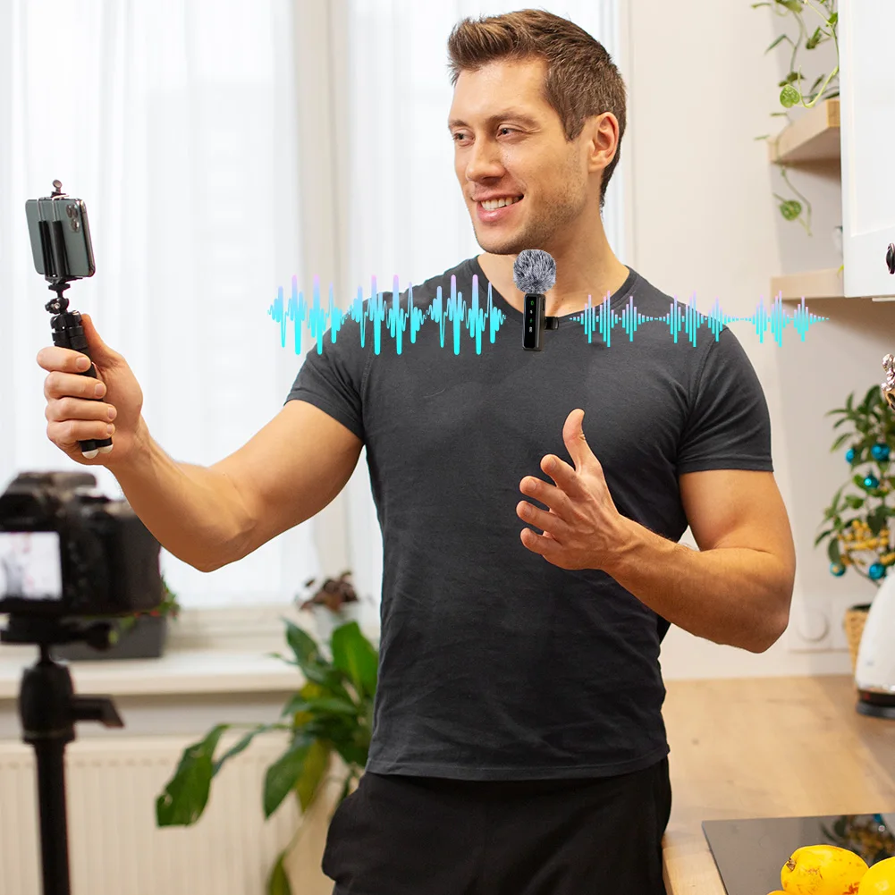 Características:1.Mini micrófono con cancelación de ruido:Equipado con un chip AI omnidireccional mejorado con cancelación de ruido, este micrófono de solapa inalámbrico reduce eficazmente el ruido mientras captura su voz, brindando una calidad de sonido clara para cada creador de contenido.Disfrute de la comodidad de una función de silencio con un solo toque sin reiniciar.