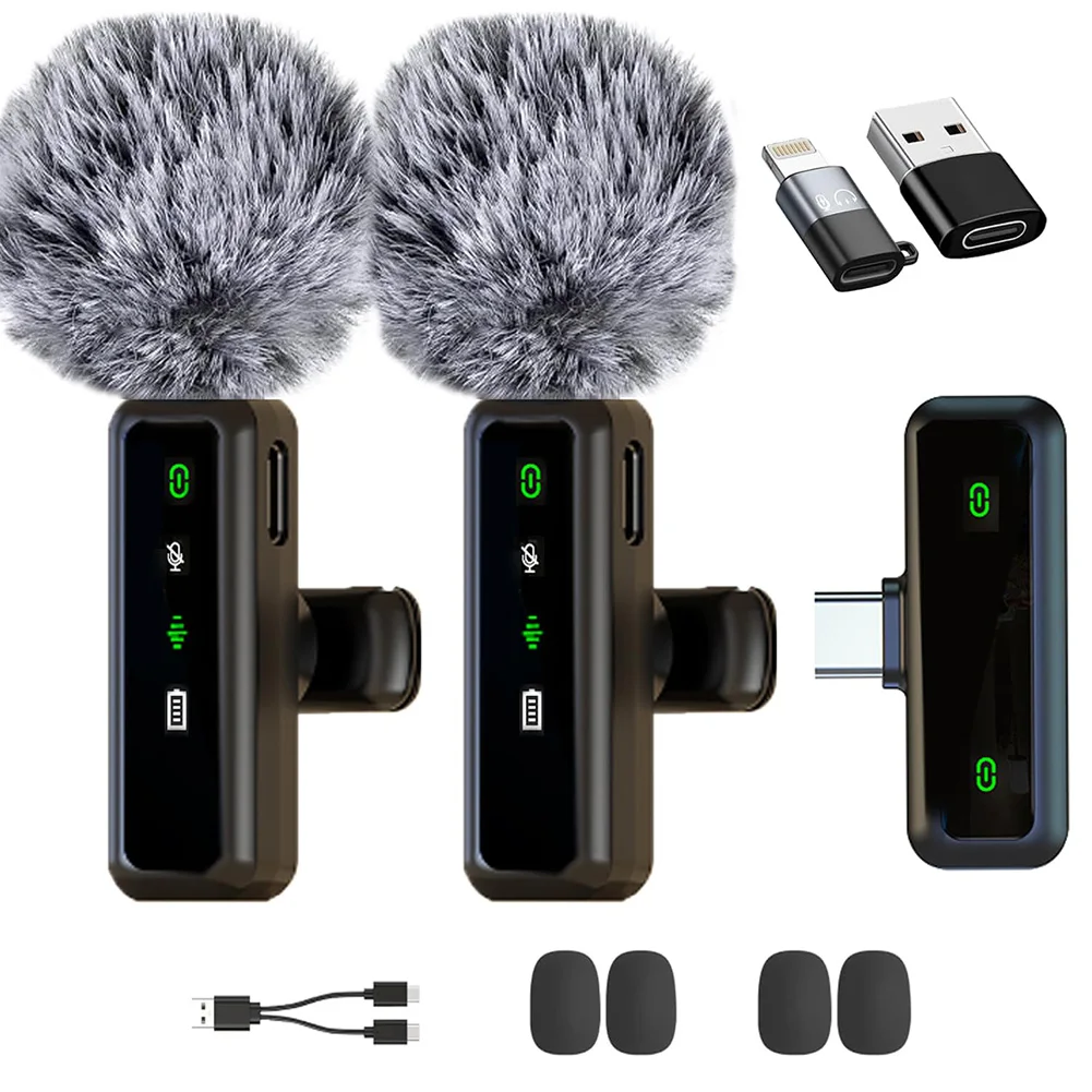 5. Paquete de micrófono de solapa inalámbrico:Incluye 2 * micrófonos, 4 * cubiertas de espuma negra, 2 * parabrisas, 1 *