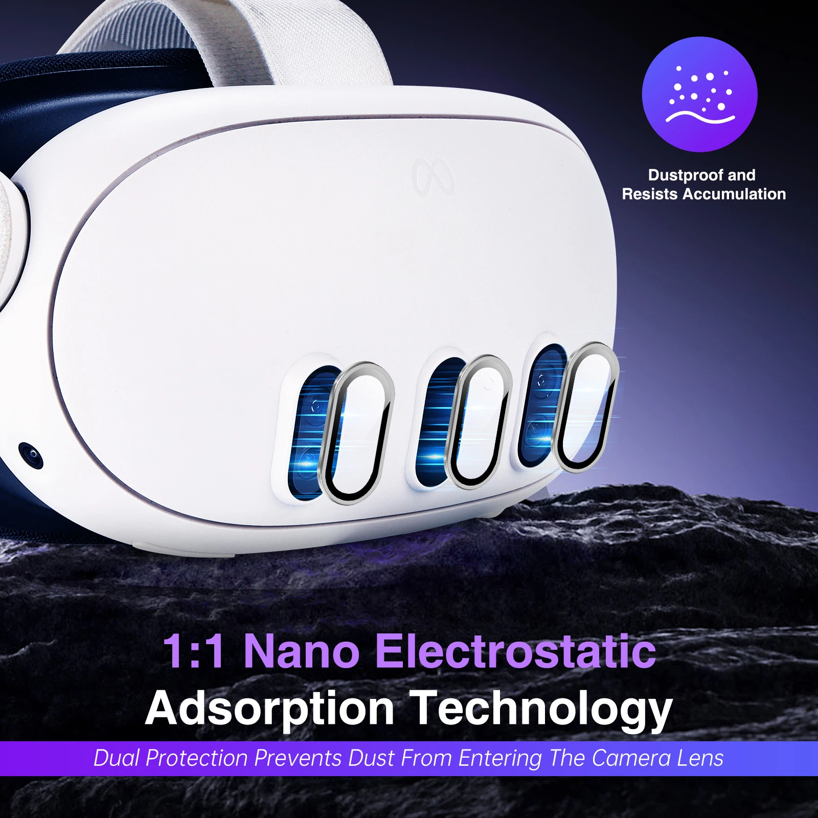Este protector de lente adopta tecnología de adsorción automática nanoelectrostatica, simplemente retire la película de la cámara trasera, ajuste la alineación con el orificio y presione suavemente, la cubierta de la cámara VR se adherirá a la lente automáticamente, no se caerá fácilmente, sin burbujas ni residuos cuando eliminado.
