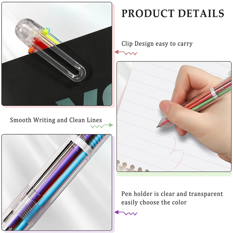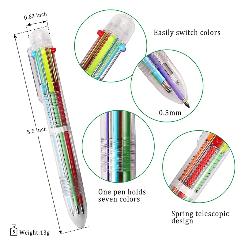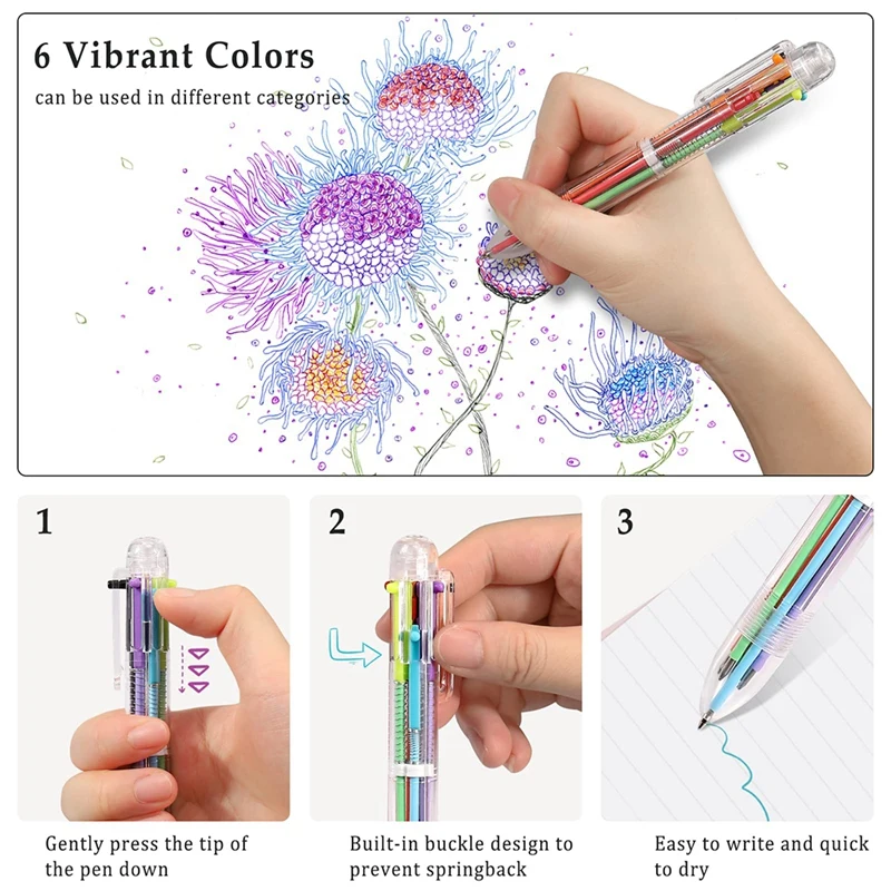 Bolígrafo de seis colores: Cada bolígrafo viene con 6 colores, desde negro, rojo, azul hasta verde, naranja y púrpura, un total de 6 diferentes colores vivos de tintas en 1 bolígrafo de barril para que los cambie a voluntad.