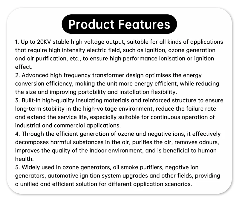 1. Con una salida estable de alto voltaje de hasta 20KV, es adecuado para diversas aplicaciones que requieren campos eléctricos de alta intensidad, como ignición, generación de ozono y purificación de aire,. Asegurando efectos de ionización o ignición eficientes