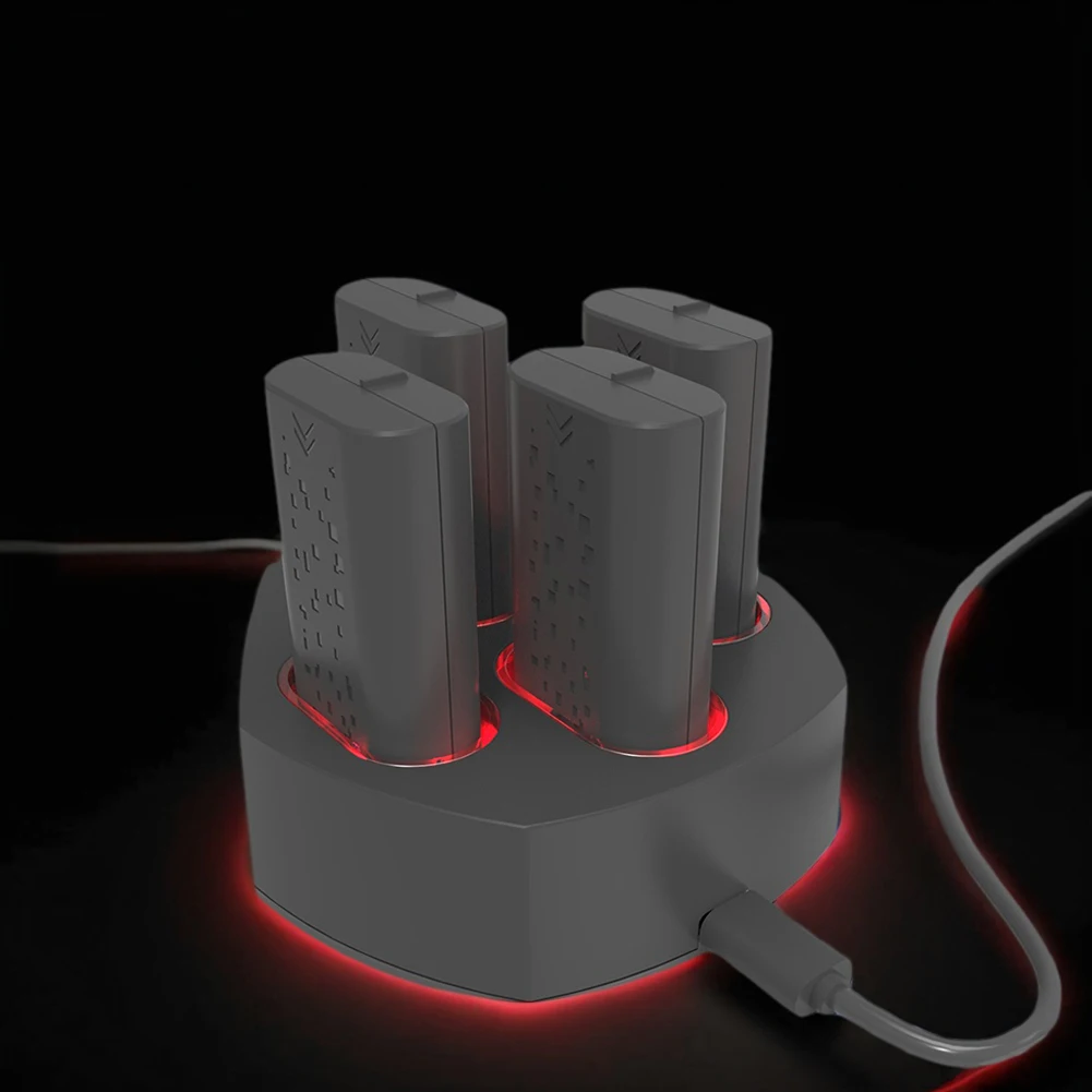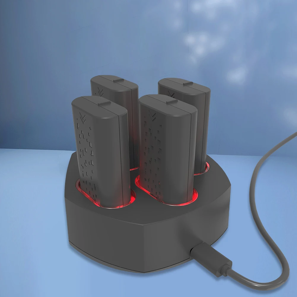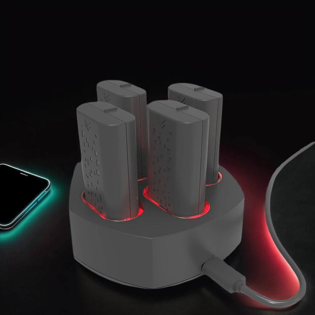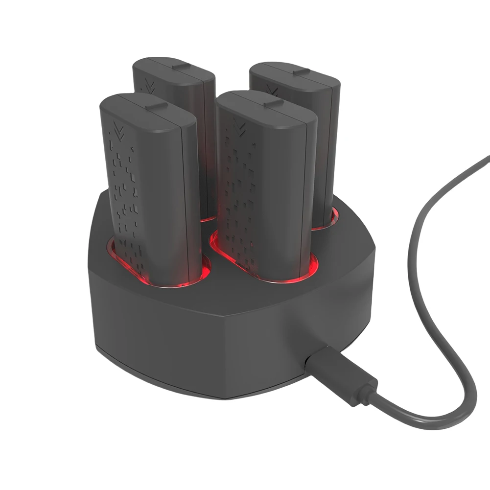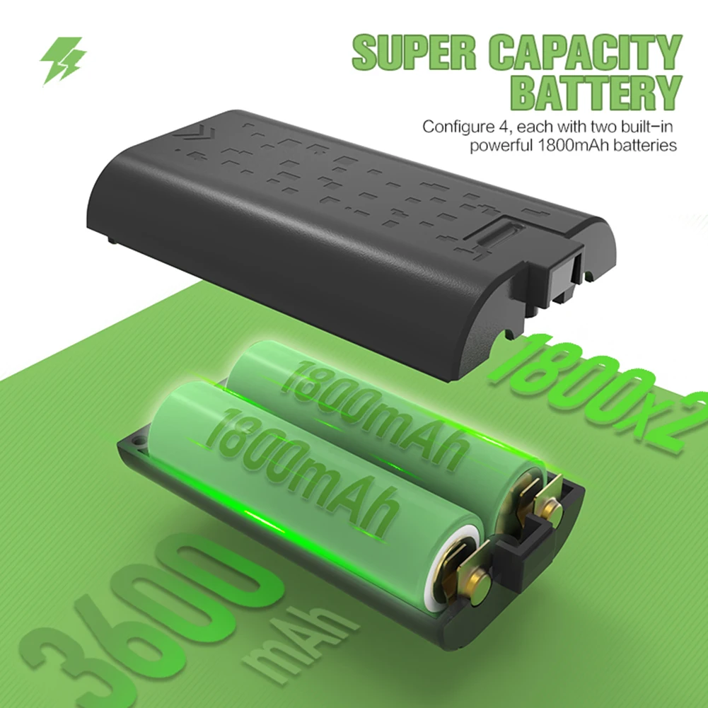 3. Baterías de alta capacidad para un juego extendido:Equipada con cuatro baterías de alta capacidad, cada una con un impresionante 3600mAh, la estación de carga rápida garantiza un juego duradero. Una sola batería completamente cargada puede proporcionar 10-12 horas de juego continuo, y solo se necesitan 2,5-3 horas para cargar completamente las cuatro baterías.