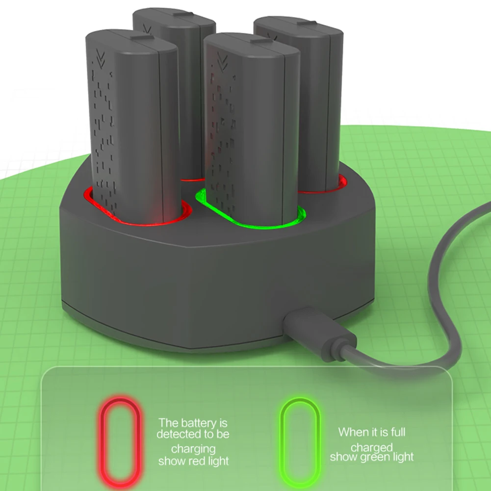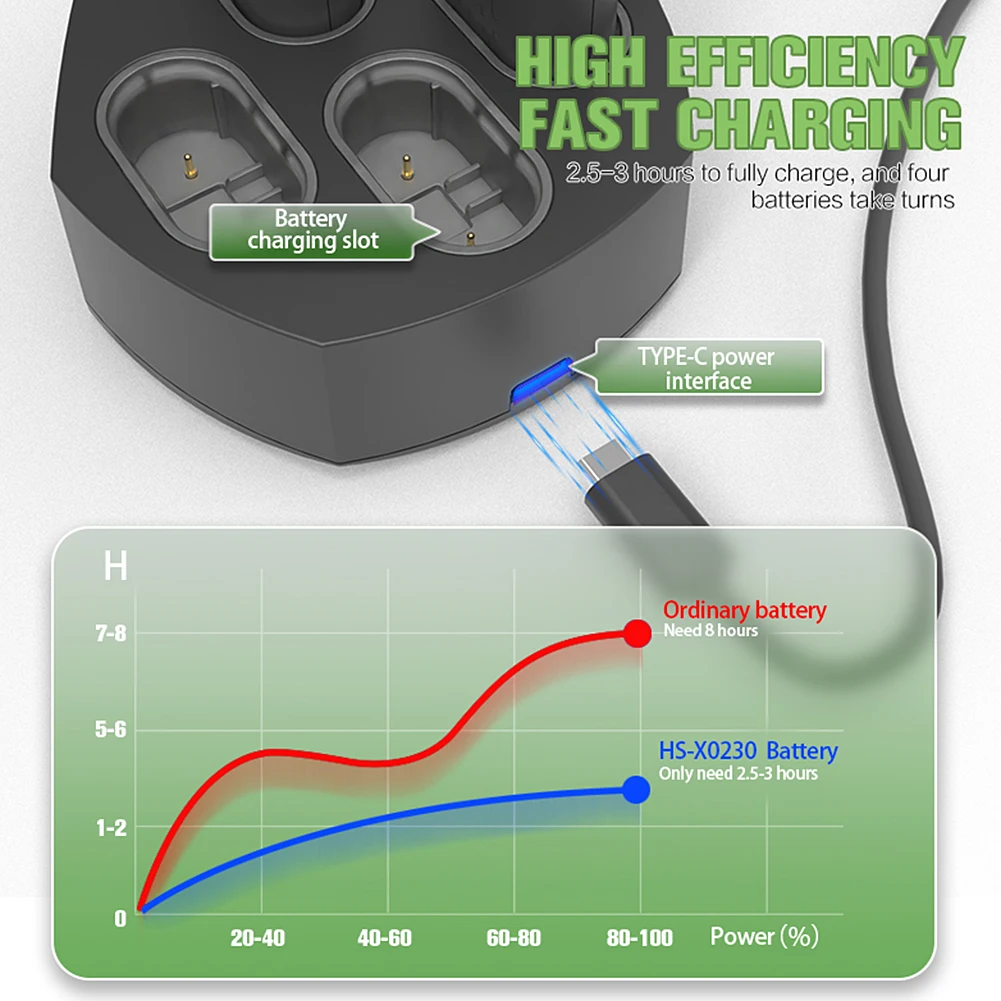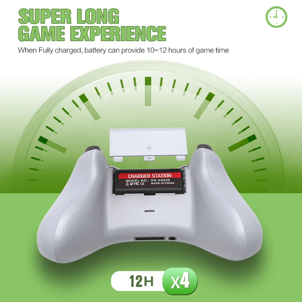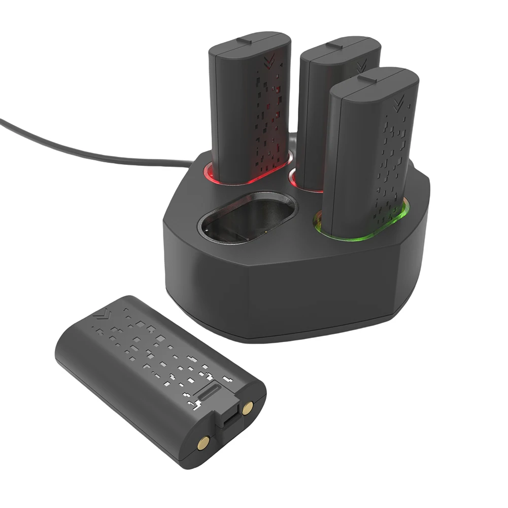 3. Baterías de alta capacidad para un juego extendido:Equipada con cuatro baterías de alta capacidad, cada una con un impresionante 3600mAh, la estación de carga rápida garantiza un juego duradero. Una sola batería completamente cargada puede proporcionar 10-12 horas de juego continuo, y solo se necesitan 2,5-3 horas para cargar completamente las cuatro baterías.