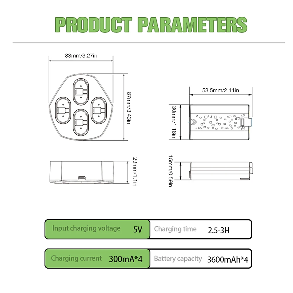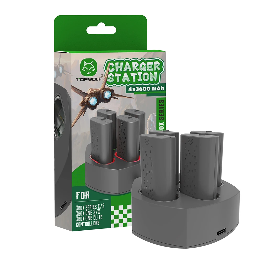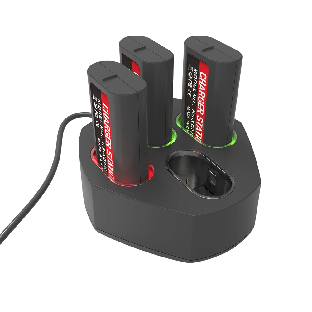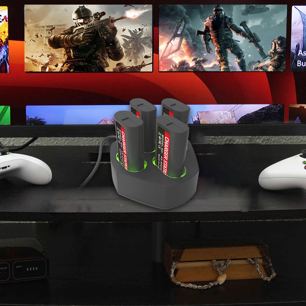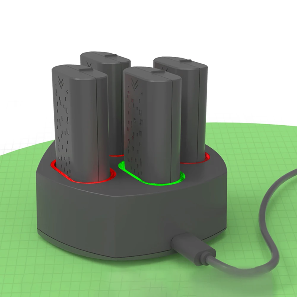 3. Baterías de alta capacidad para un juego extendido:Equipada con cuatro baterías de alta capacidad, cada una con un impresionante 3600mAh, la estación de carga rápida garantiza un juego duradero. Una sola batería completamente cargada puede proporcionar 10-12 horas de juego continuo, y solo se necesitan 2,5-3 horas para cargar completamente las cuatro baterías.