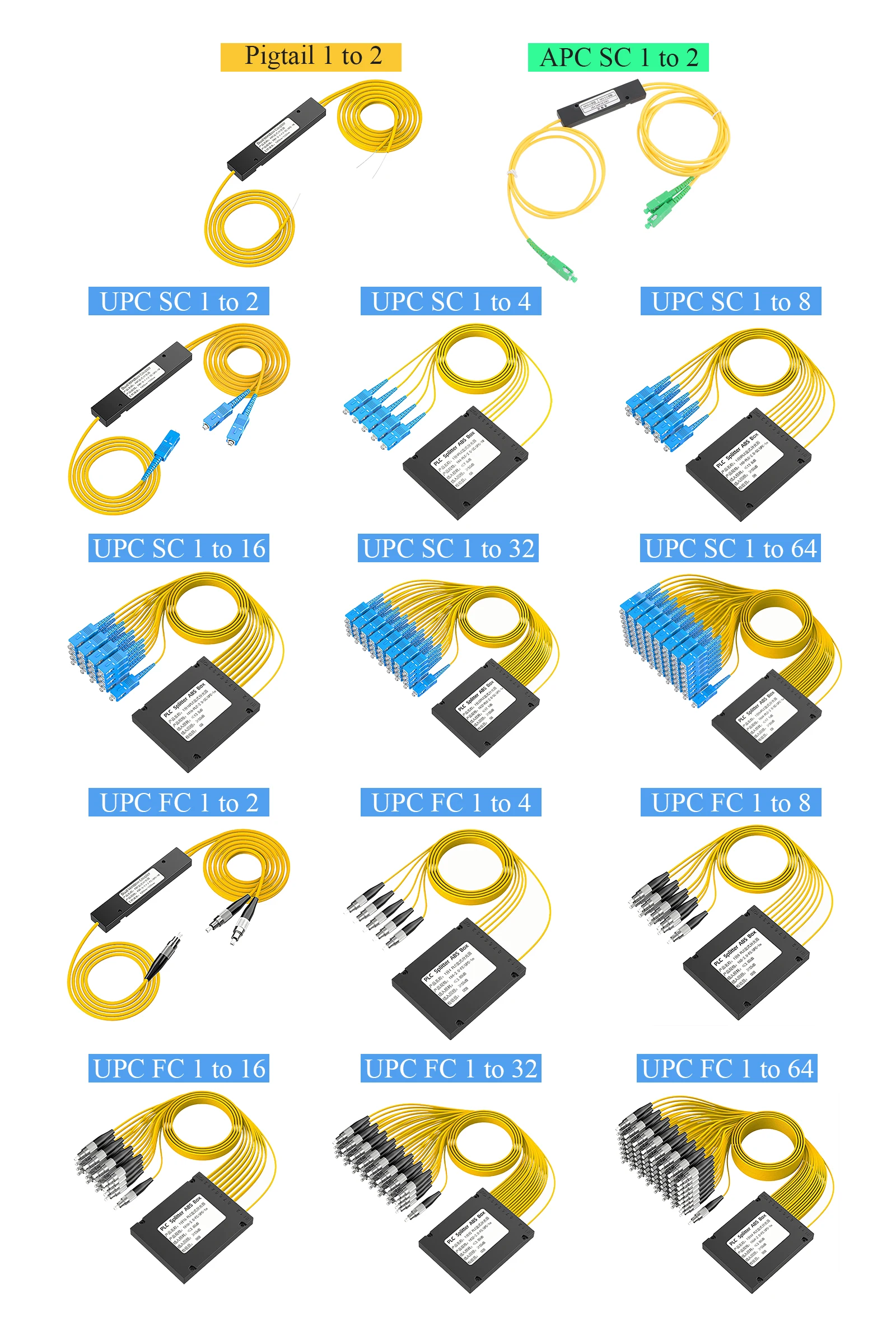 Paquete de caja de baja pérdida 1x4/8/16/32/64 divisor de fibra óptica monomodo 1310-1550nm SC/UPC FC/UPC conector 2M para FTTH y LAN