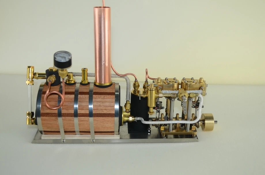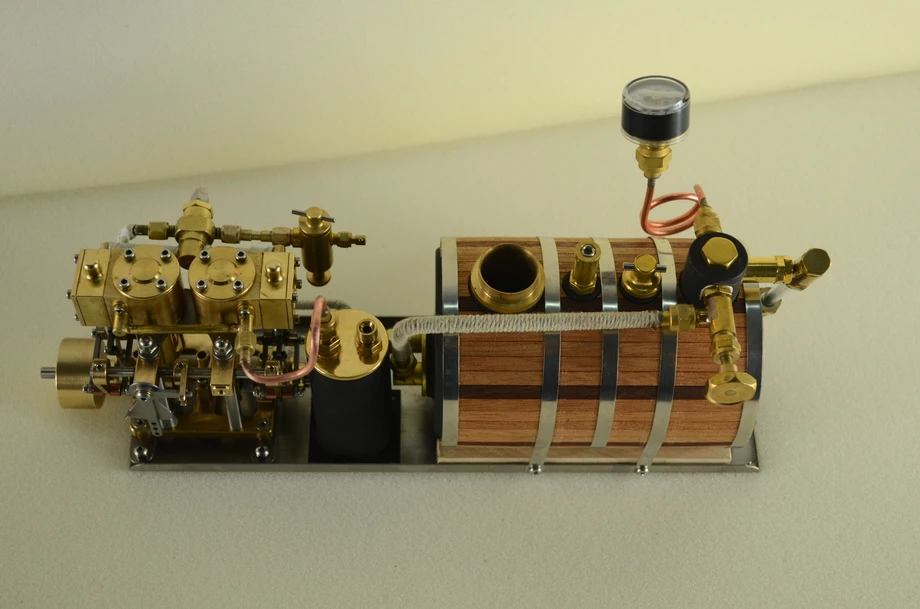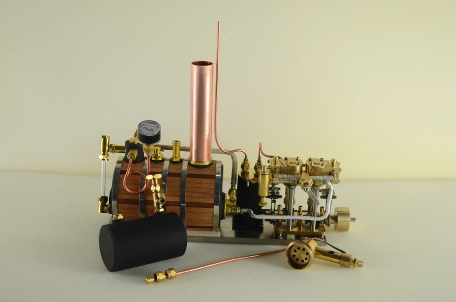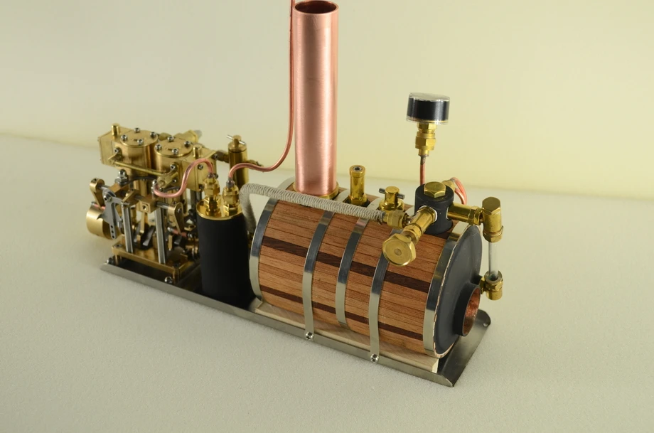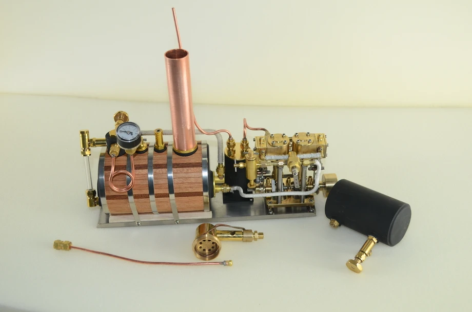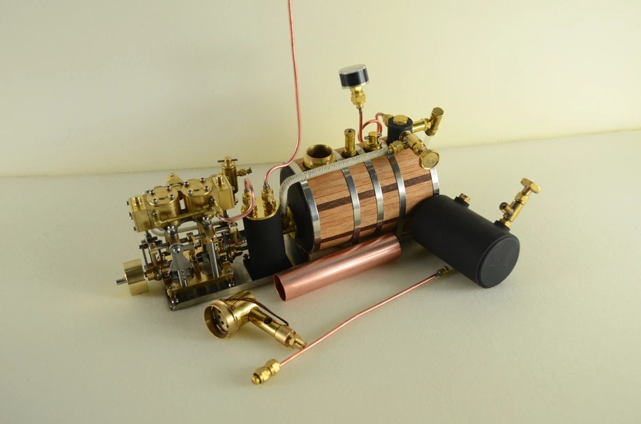 La caldera mide 130 mm de largo, 80 mm de diámetro y 200 mm de alto.Está cuidadosamente elaborado en cobre y cuenta con una válvula de seguridad, un observador de nivel de agua, un manómetro y un tanque de recolección de aguas residuales.