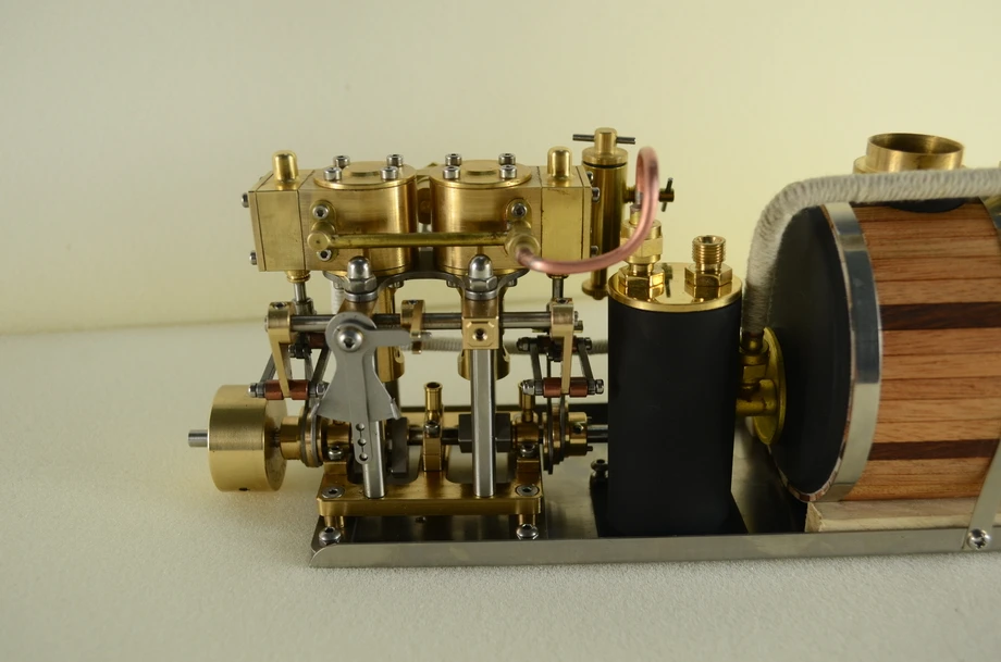 Se trata de un motor de vapor alternativo marino de doble cilindro más complejo con funciones completas.Puede iniciarse y detenerse a voluntad, acelerar y desacelerar a voluntad y lograr una rotación positiva e inversa.