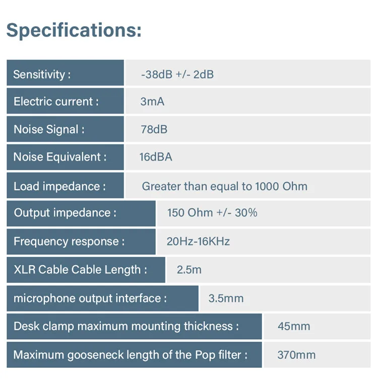 Descripción del productoEspecificación Brazos plegables: minimiza el tamaño del envío para un fácil almacenamiento; Brazo de tijera-Ajuste totalmente flexible para ángulos y alturas requeridas Abrazadera ajustable para una fácil instalación en el escritorio y ajuste seguro a cualquier soporte de micrófono para una fácil instalación y uso. Muelles de suspensión dobles en cada brazo para mayor estabilidad. Puerto de audio dual: Conecte tanto la entrada del micrófono como la salida de auriculares/altavoz.F