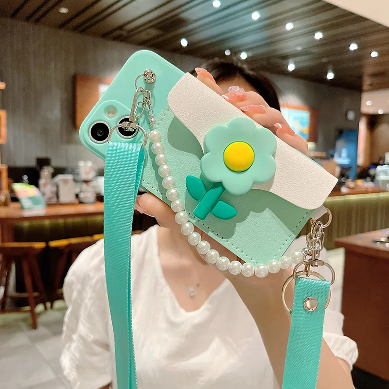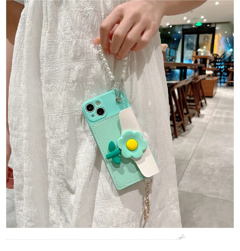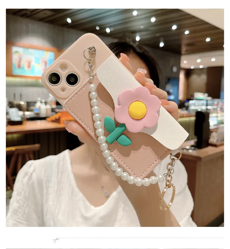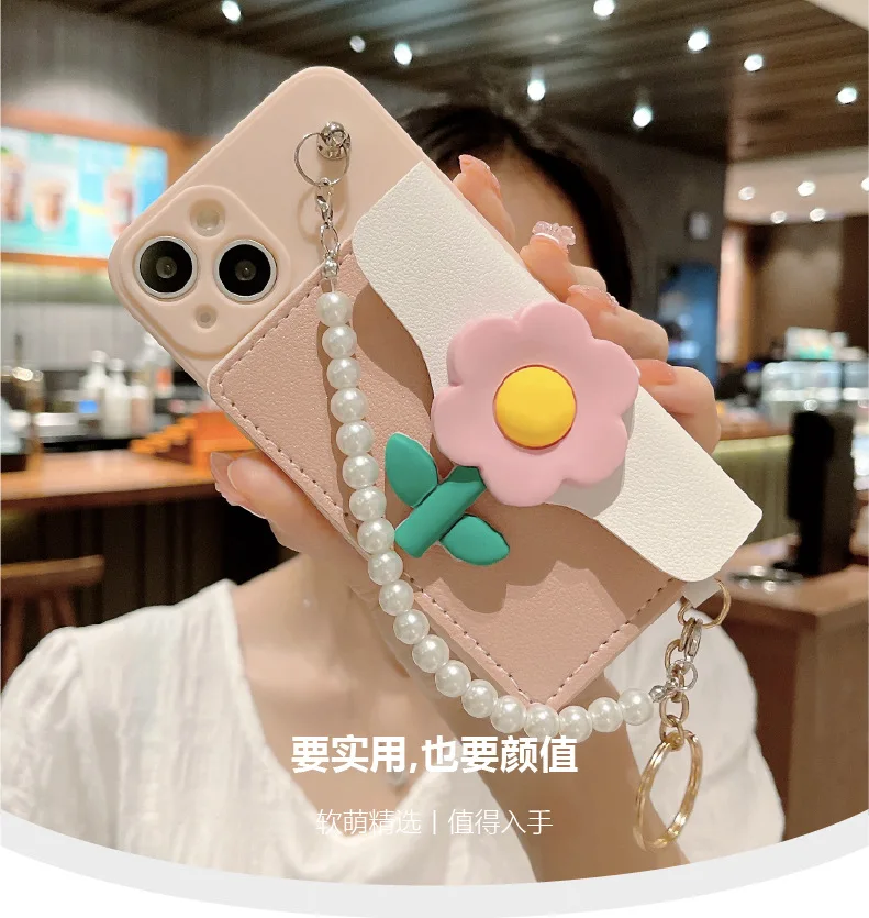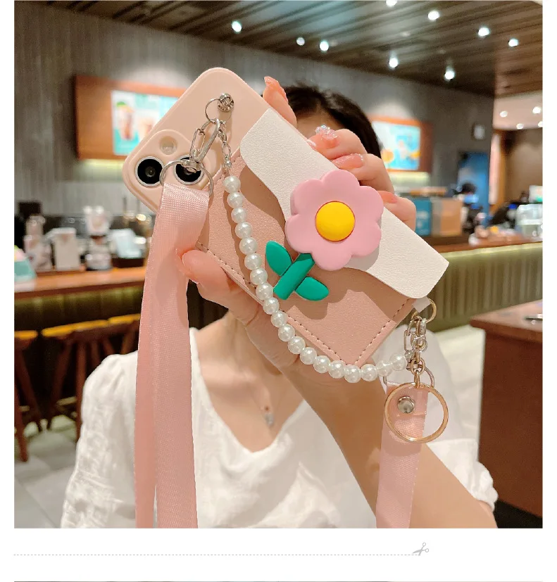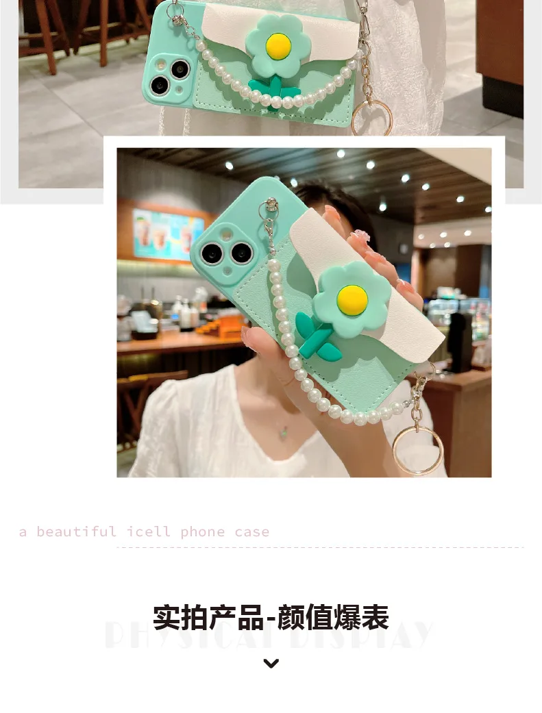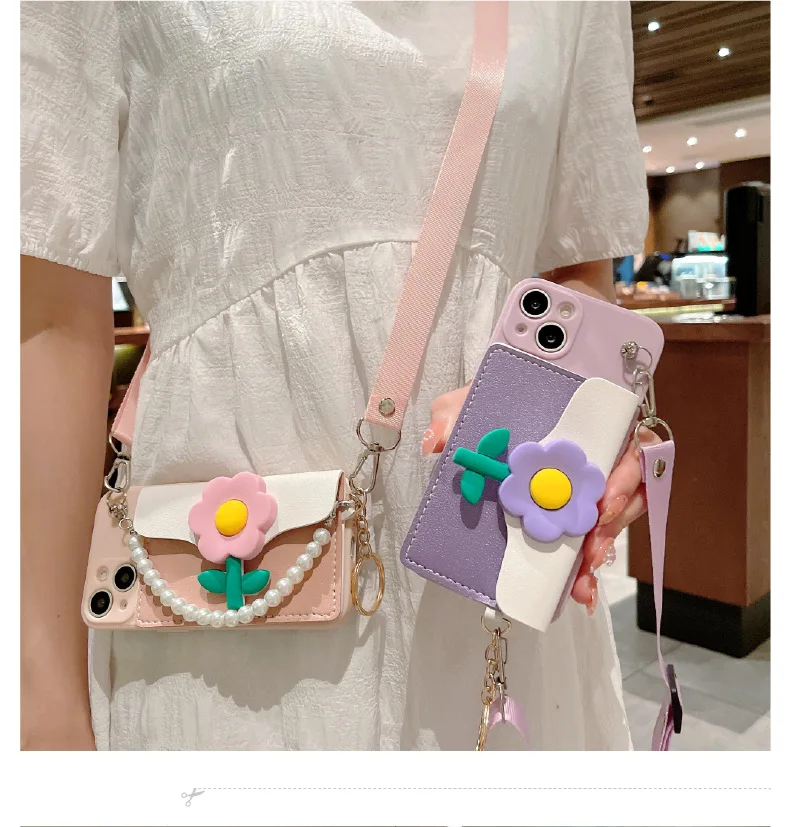 Comprar Paquete de tarjeta de flores, funda de teléfono con correa de cadena de perlas para Apple 14promax IPhone13/12