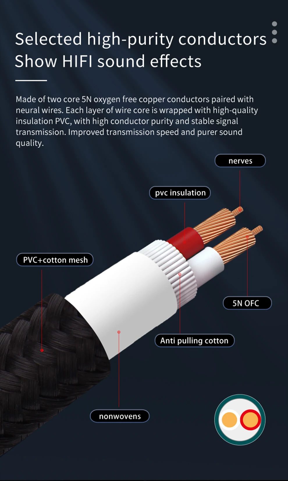 ⭐.Conductores seleccionados de alta pureza Muestra efectos de sonido HIFI Hecho de conductores de cobre libre de oxígeno 5N de dos núcleos combinados con cables neuronales.Cada capa de núcleo de alambre está envuelta con PVC aislante de alta calidad, con alta pureza de conductor y transmisión de señal estable.Velocidad de transmisión mejorada y calidad de sonido más pura.