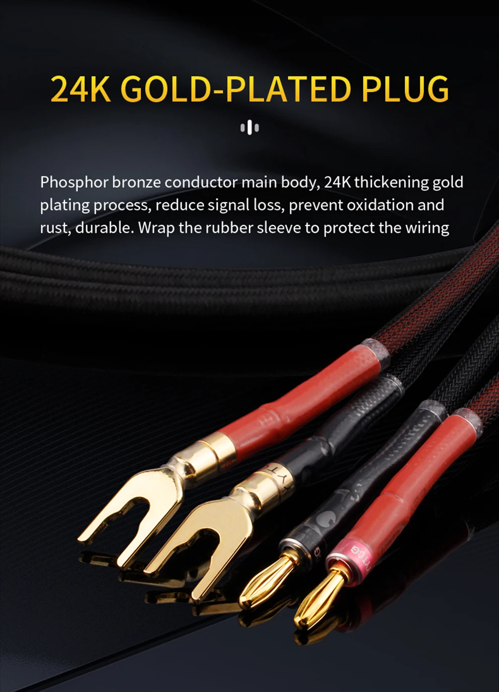 Cuerpo principal del conductor de bronce fosforado, proceso de chapado en oro de espesamiento de 24 quilates, reduce la pérdida de señal, previene la oxidación y el óxido, es duradero.Envuelva la funda de goma para proteger el cableado.