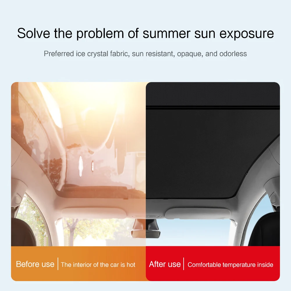 El marco del parasol de techo de vidrio está hecho de aleación de acero al manganeso, que no se deforma fácilmente. La red de sombra está hecha de 6 capas de material compuesto. Y radiación de calor y reduce la temperatura dentro del coche sin cambiar el estilo minimalista del coche.