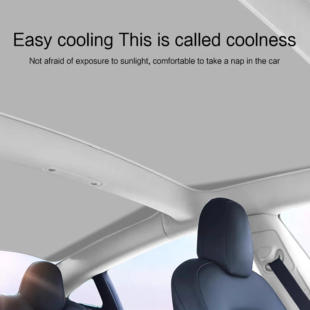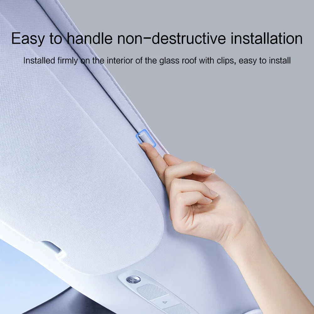 Construido con tela de malla ligera con un marco rígido plegable, el parasol de techo de vidrio bloquea 95% de transmitancia luminosa sin comprometer la visibilidad hacia atrás.