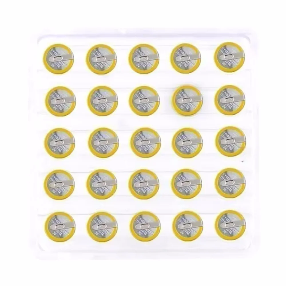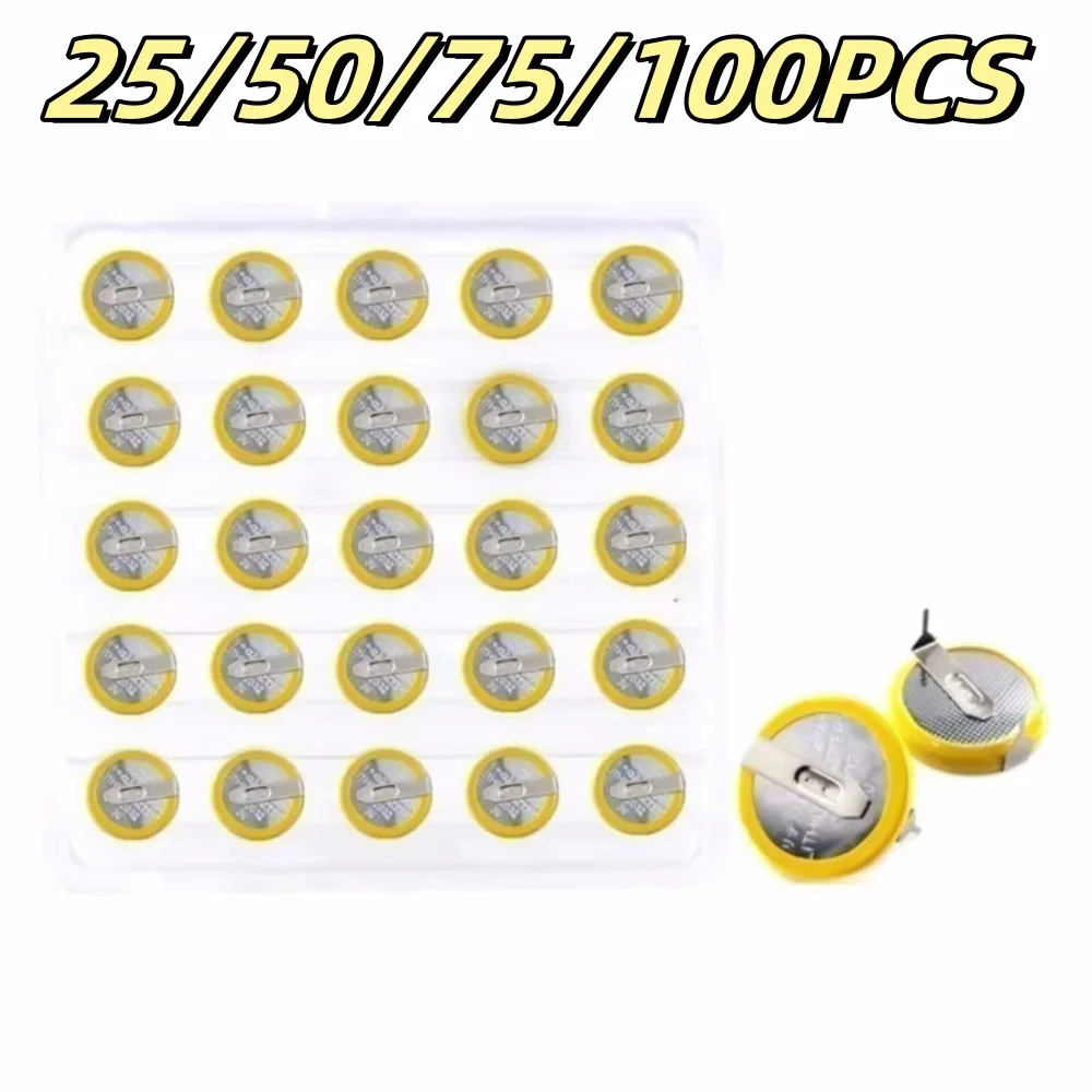 Batería de botón CR2032 de 100-25 piezas con pies de soldadura horizontales de 2 pines, pilas de botón de litio de 210mAh y 3V con pestañas de soldadura