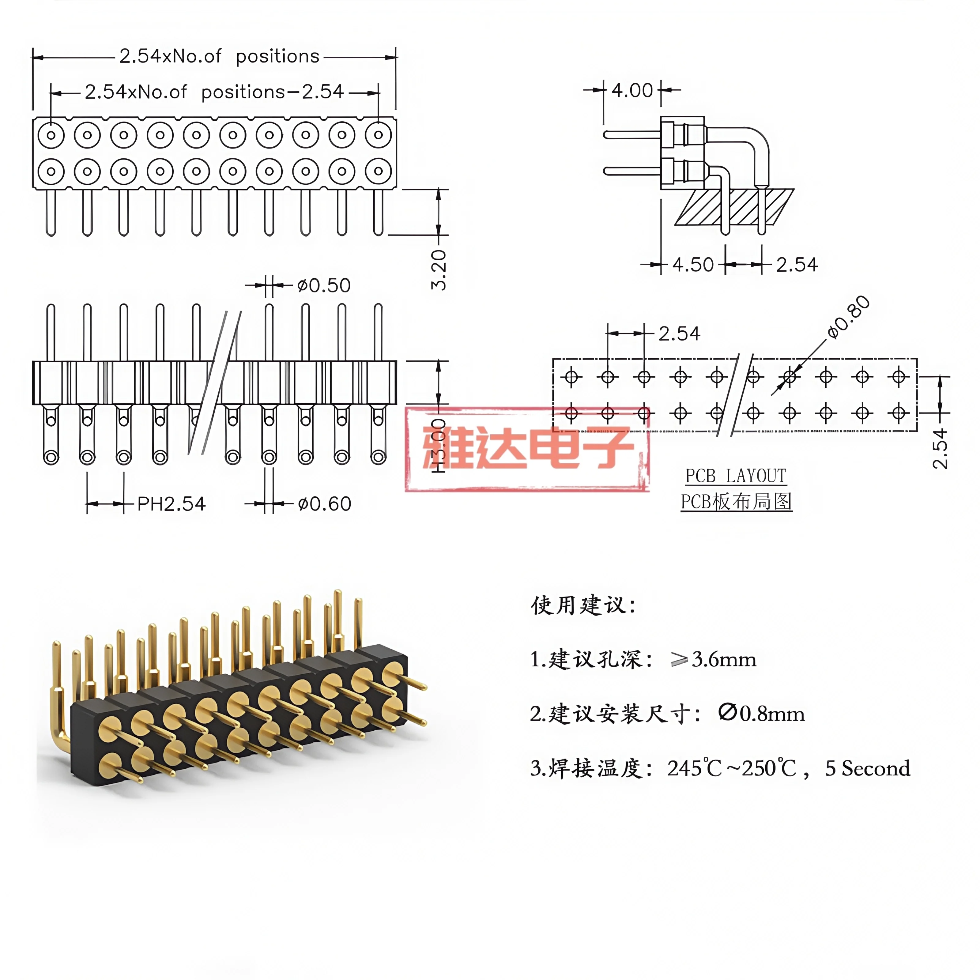Paso de 2,54 mm/2,0 mm Paso de dos extremos chapados en oro, tipo de inserción curva de 90 grados, 2*2P, 2*3P, 2*4P, 2*5P, 2*6P-40PDiagrama de muestra con un espacio de 2,54 mm:Diagrama de muestra con un espacio de 2,0 mm