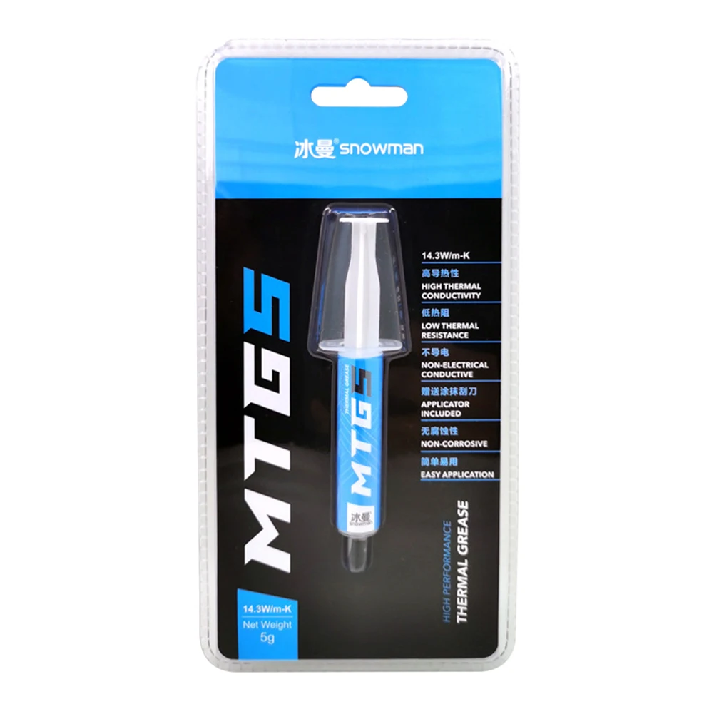 Especificación: Marca: muñeco de nieve Modelo: MTG5 / MTG10 Conductividad térmica: 14,3 W/m-K Contenido neto: 5g / 10g (opcional) Color: Gris Rango de aplicación: disipador de calor de CPU, GPU, LCD, LED, productos electrónicos