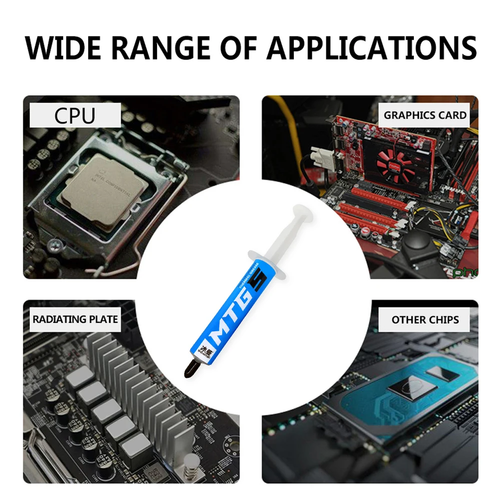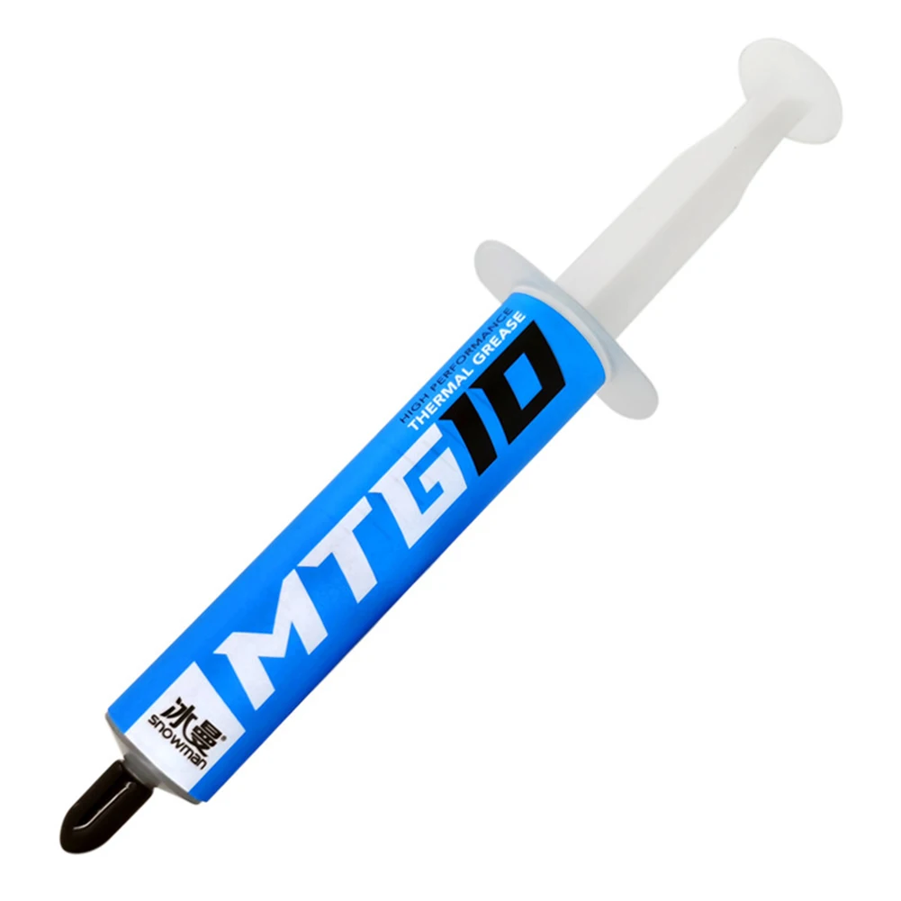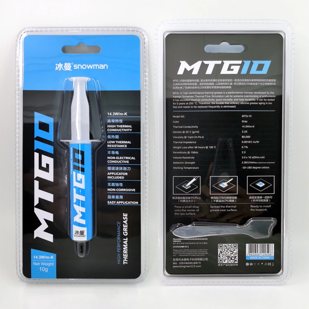 Jeringa de 5/10g MTG5/MTG10 pasta de grasa conductora térmica 14,3 W/mK para procesador AMD Intel CPU disipador de calor ventilador refrigeración VGA compuesto yeso Característica: 1. No corrosivo; 2. No conductor; 3. Baja resistencia térmica; 4. Resistente a altas temperaturas de 280 grados; 5. Anti-envejecimiento y duradero.
