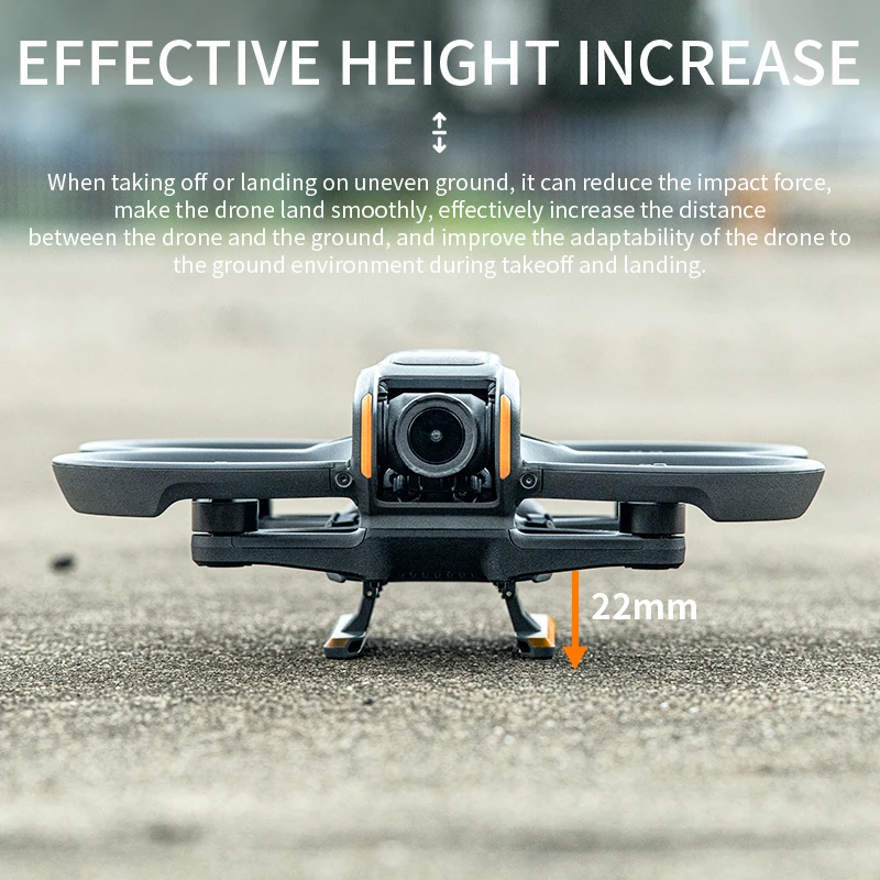 2. Puede aumentar eficazmente la distancia entre el Dron y el suelo en 22 milímetros. Cuando el AVATA 2 despega o aterriza en terreno irregular, reduce la fuerza de impacto, permite que el Dron aterrice sin problemas y protege el fuselaje, los sensores y la cámara del cardán del AVATA 2 DE DAÑOS. Evita que los desechos del suelo o los daños por agua ensucien o dañen el fuselaje del Dron, el cardán y las hélices.