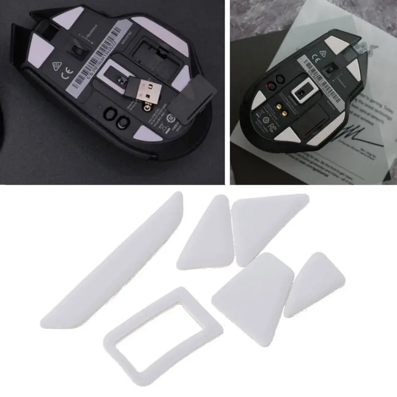 Después de quitar la película protectora transparente en los pies del ratón, cuidadosamente los pies en la parte inferior del ratón para la cáscara, luego aplique una ligera presión para ajustar el pie.