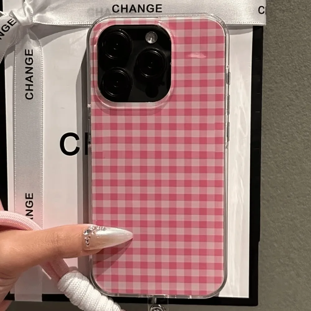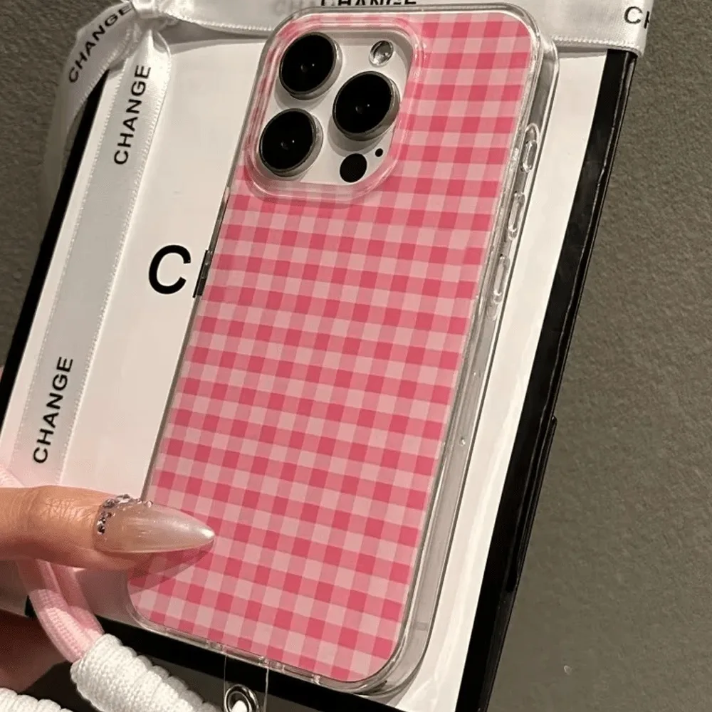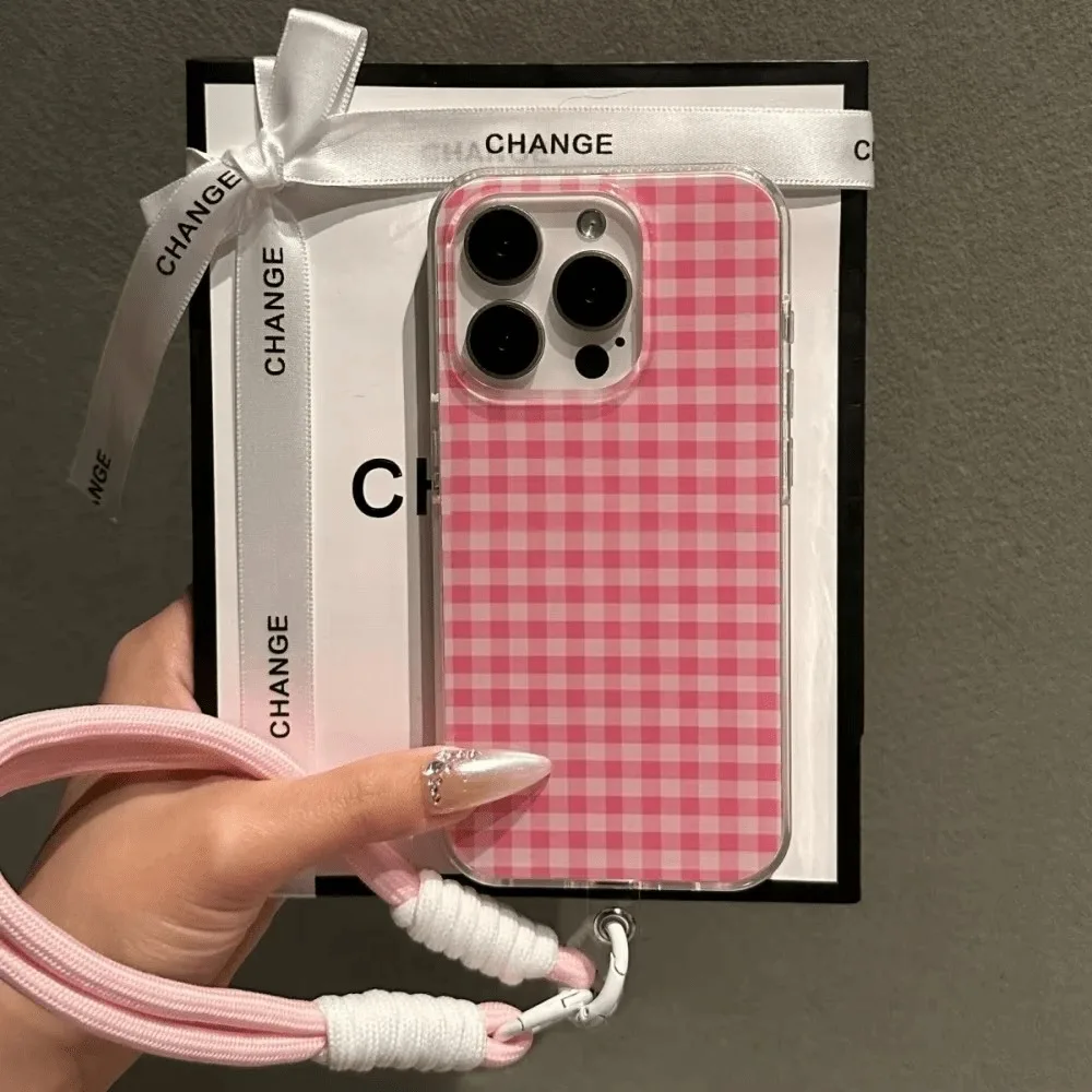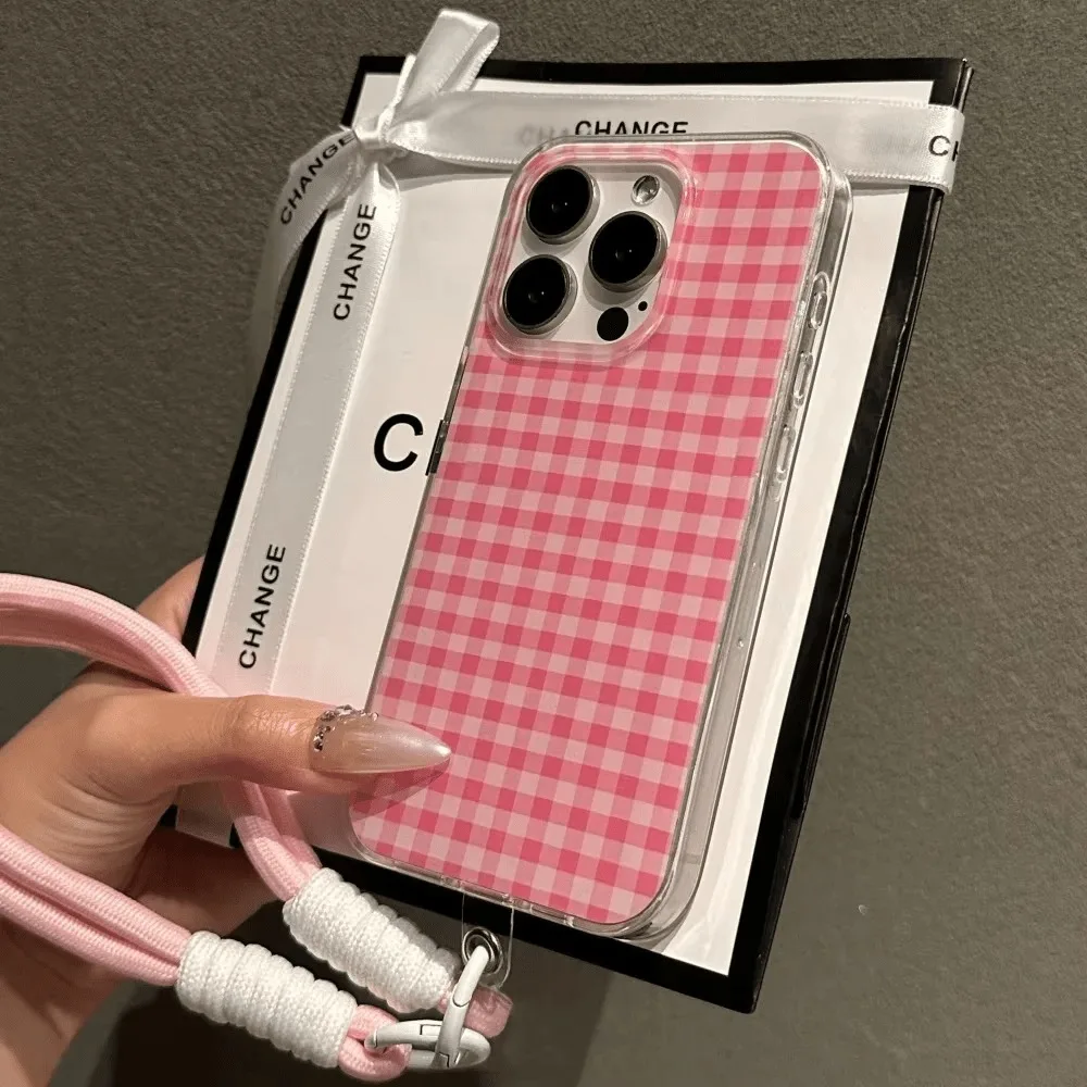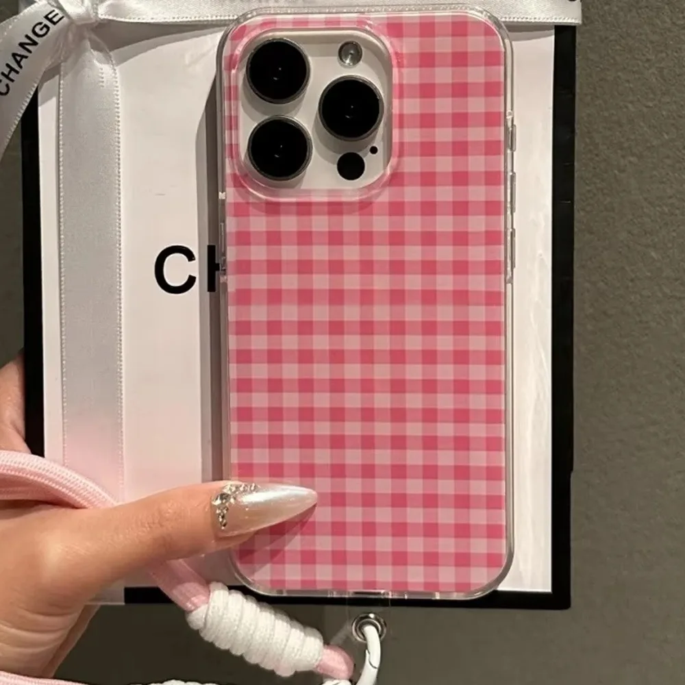 Comprar Patrón de cuadros rosa con cordón funda de teléfono para iPhone 17 16 15 14 13 12 11 Pro Max 16E 17Air X XR XS Max 7 8 Plus cubierta suave
