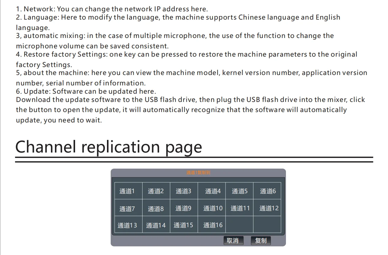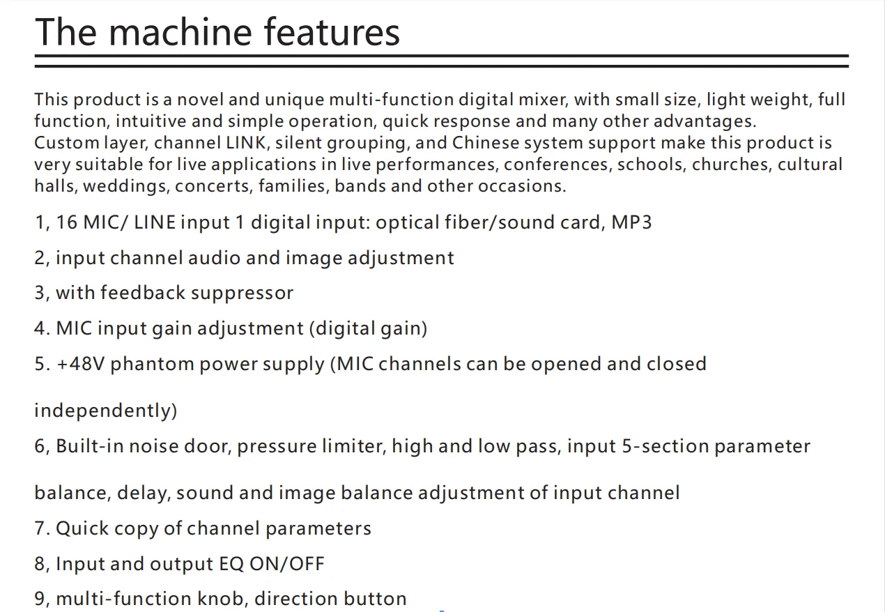 This product is a novel and unique multi-function digital mixer, with small size, light weight, full function, intuitive and simple operation, quick response and many other advantages. Custom layer, channel LINK, silent grouping, and Chinese system support make this product is very suitable for live applications in live performances, conferences, schools, churches, cultural halls, weddings, concerts, families, bands and other occasions.