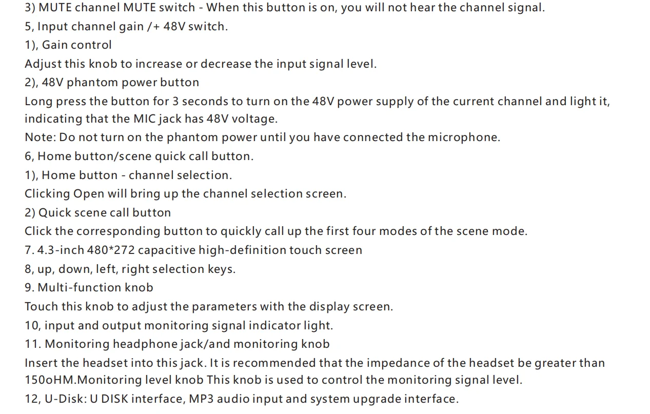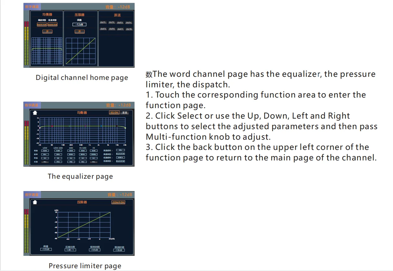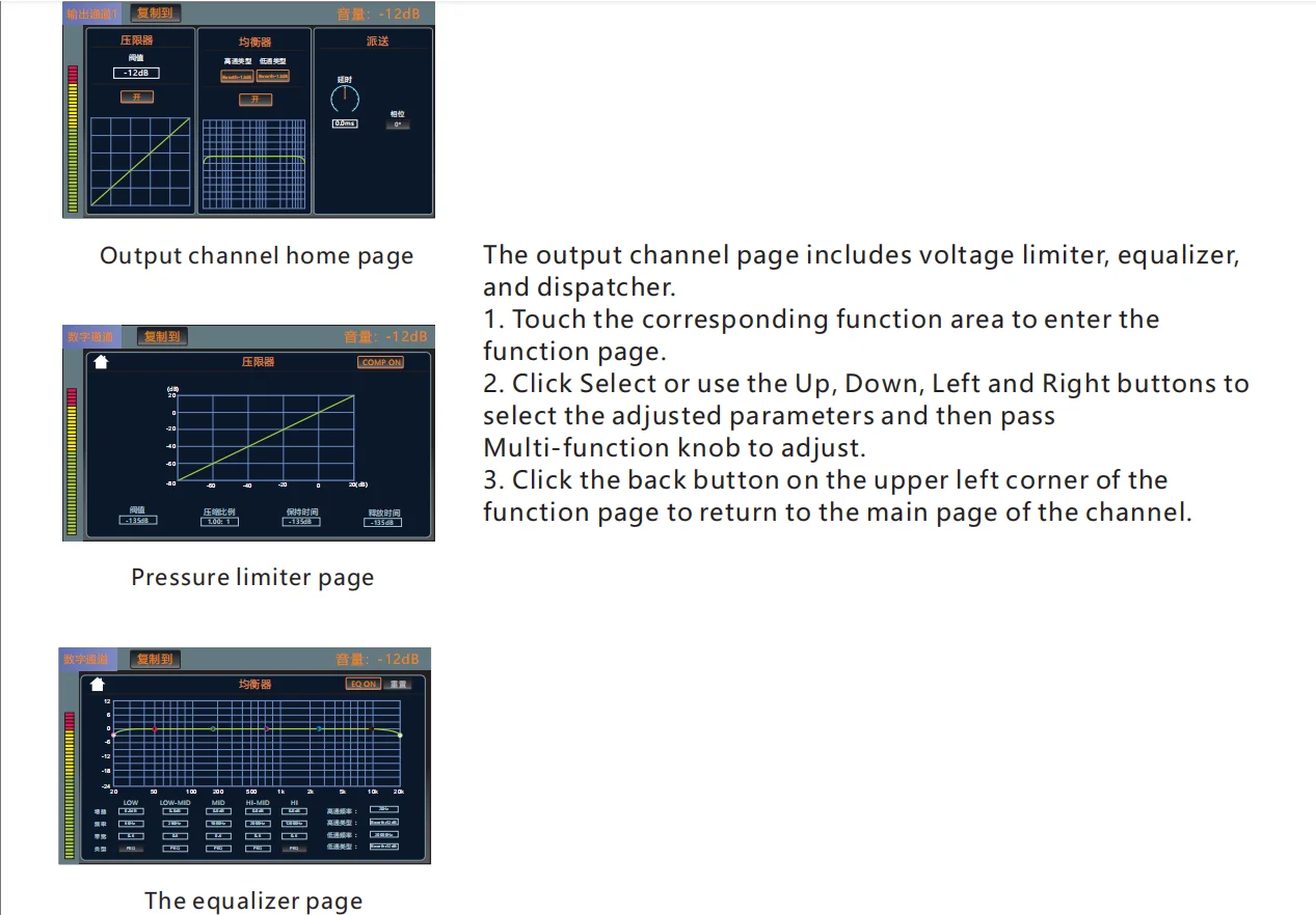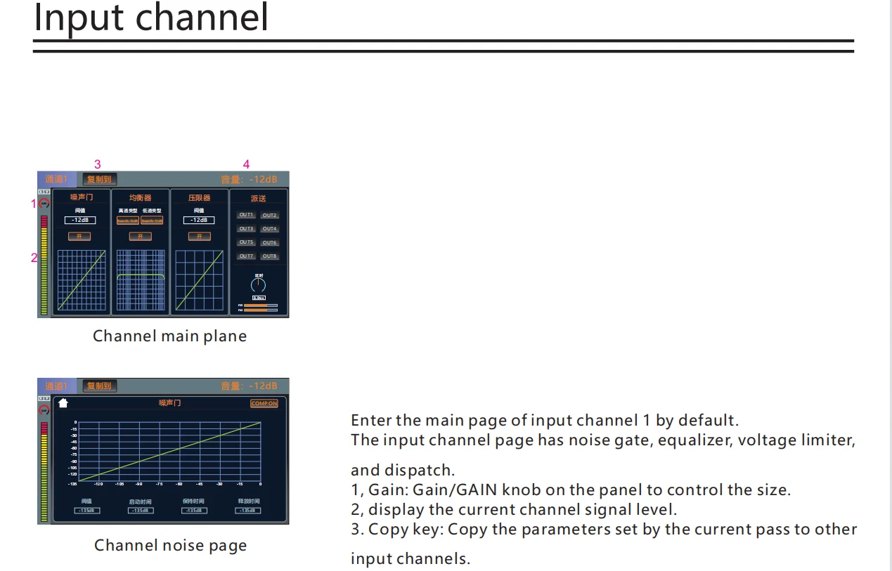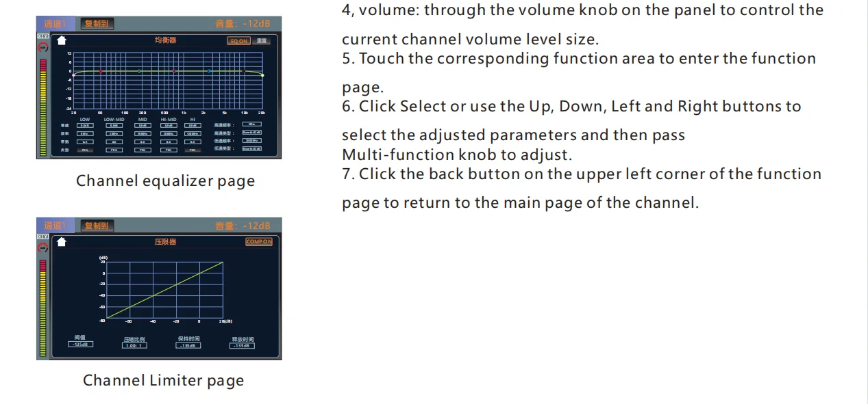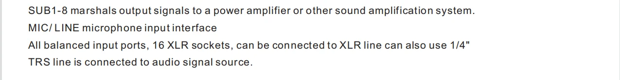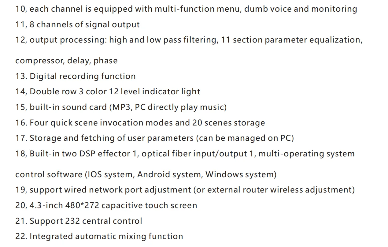 •・Each input channel has built-in noise gate, compressor, high and low pass, input 5-band parameter equalization, delay, channel sound image balance adjustment