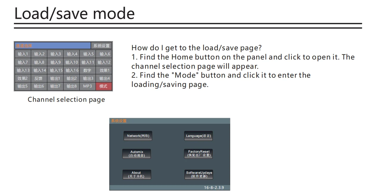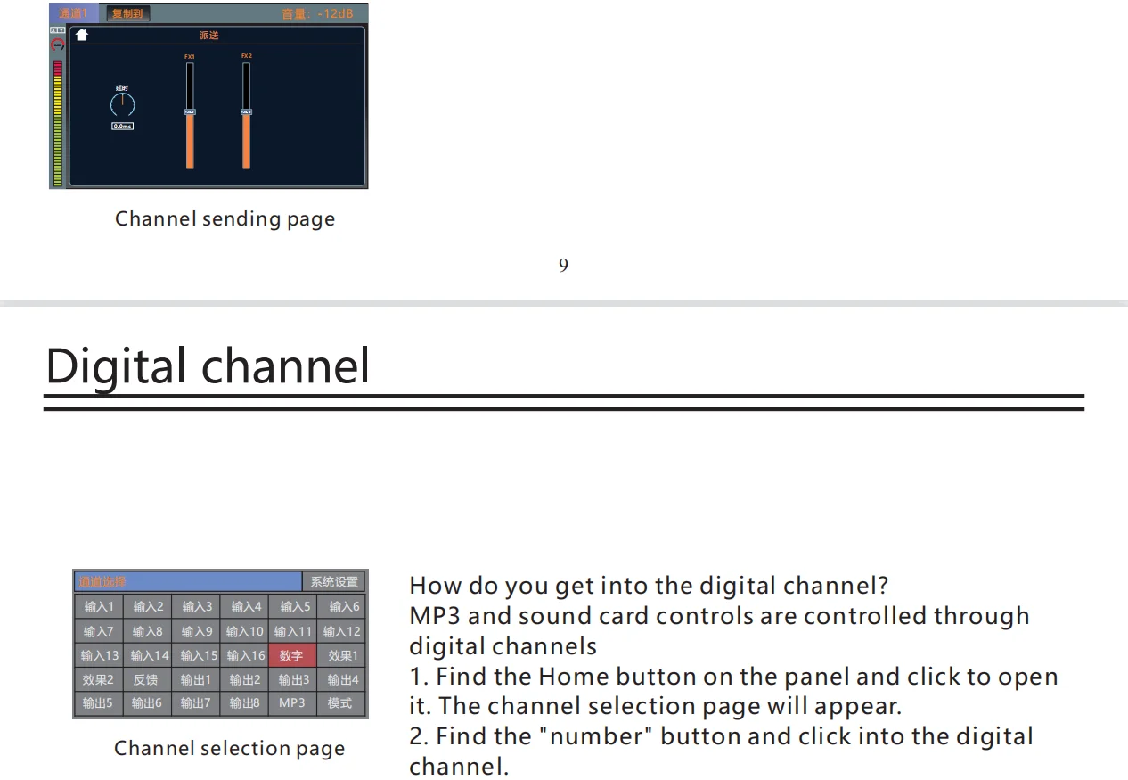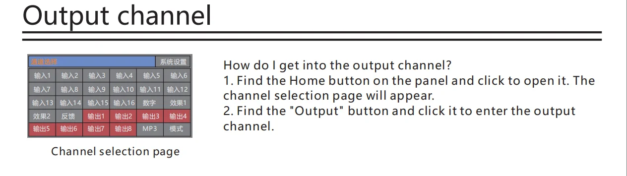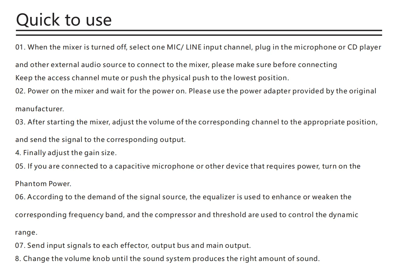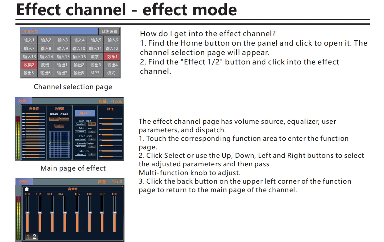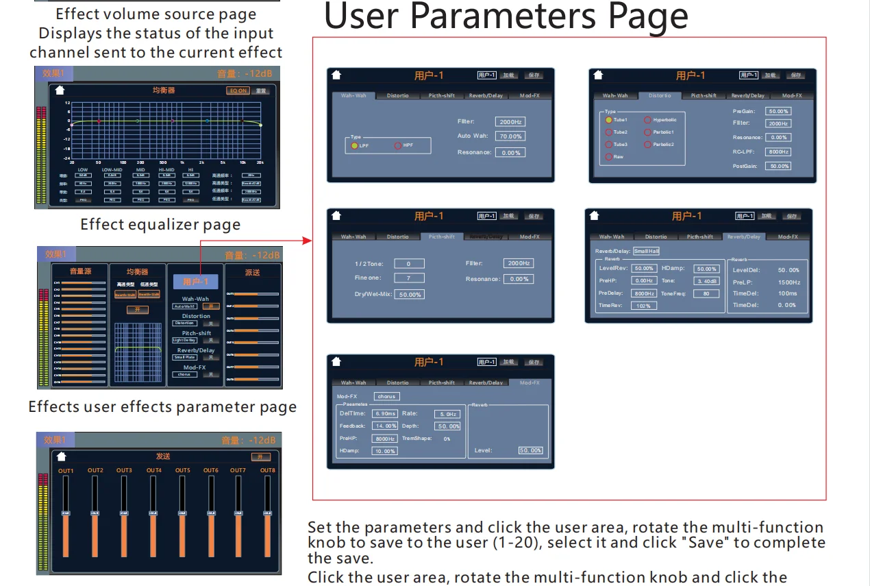 •・Each input channel has built-in noise gate, compressor, high and low pass, input 5-band parameter equalization, delay, channel sound image balance adjustment