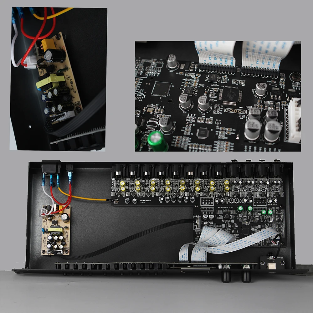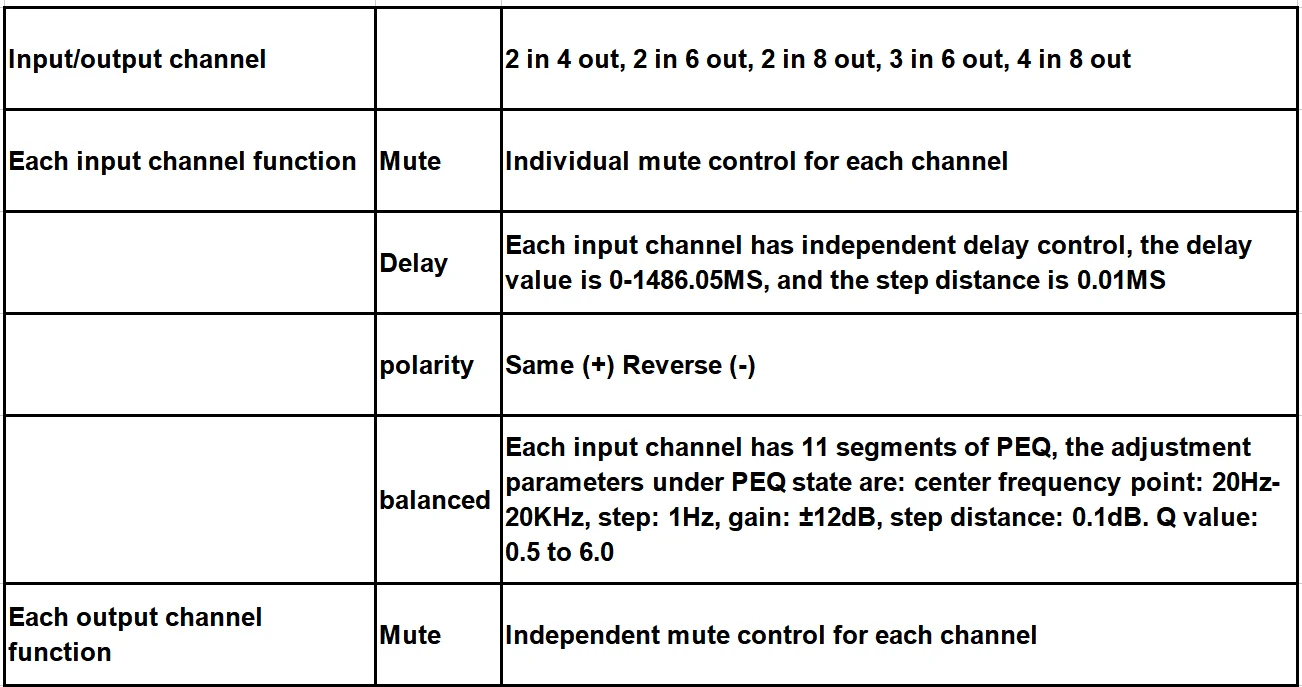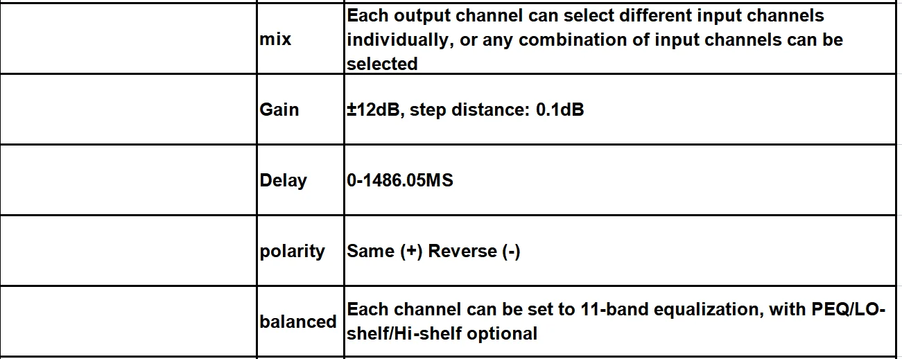 ● El retardo de cada canal de entrada puede alcanzar los 1490ms, equipado con un ecualizador paramétrico de 11 bandas con características de filtrado opcionales