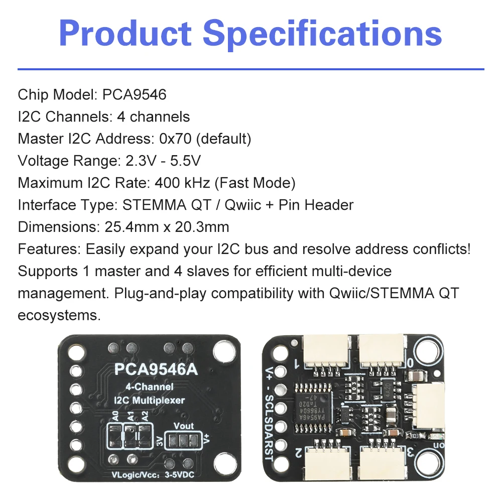 Función: ¡Ampliar fácilmente el bus I2C y resolver conflictos de direcciones!Admite 1 maestro y 4 esclavos, gestiona eficientemente múltiples dispositivos, plug and play, compatible con el ecosistema Qwiic/TEMMA QT