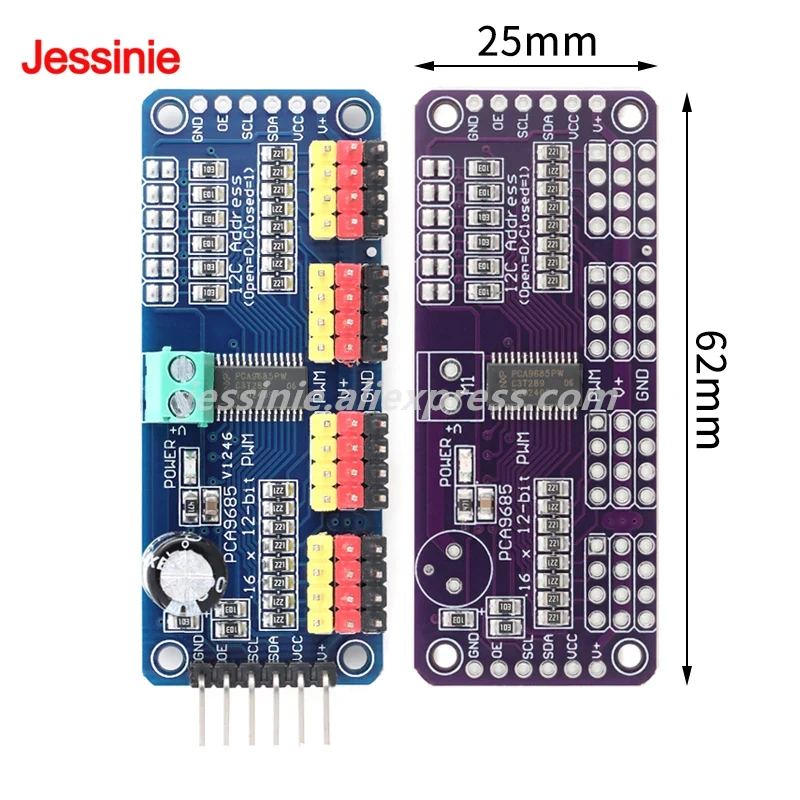 Características ● Comunicación I2C ● Oscilador de cristal incorporado de 25MHz ● 16 servoconectores de 3 pines para conectar hasta 16 servomotores a la vez ● Diseño en cascada ● Todas las líneas de salida PWM tienen una resistencia de 220 ohmios para protección de salida de señal. ● Salidas configurables push-pull o de circuito abierto ● Pin de habilitación de salida para desactivar rápidamente todas las salidas ● Condensador de 10V 1000uf en entrada de alimentación servo (V+)