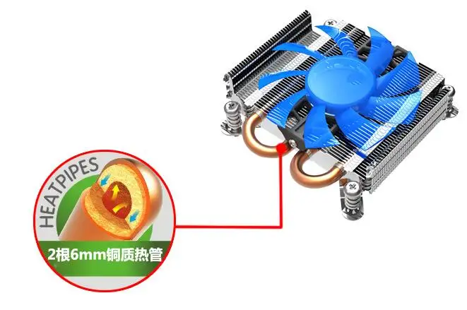 Thinner design, two 6mm copper heat pipes export heat from the CPU through the copper base, 8CM 4PIN fan, intelligent temperature control.